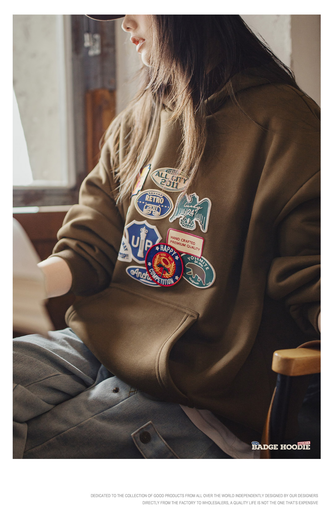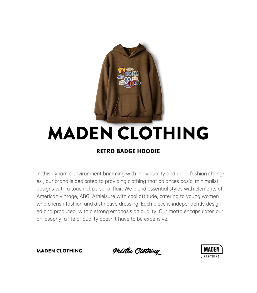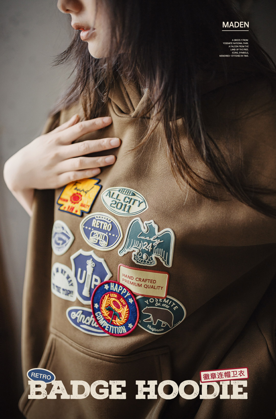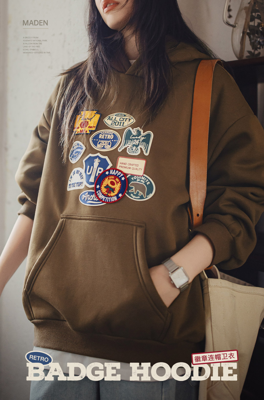 马登咖色美式重磅宽松摇粒绒加绒加厚徽章套头连帽衫卫衣女士秋冬