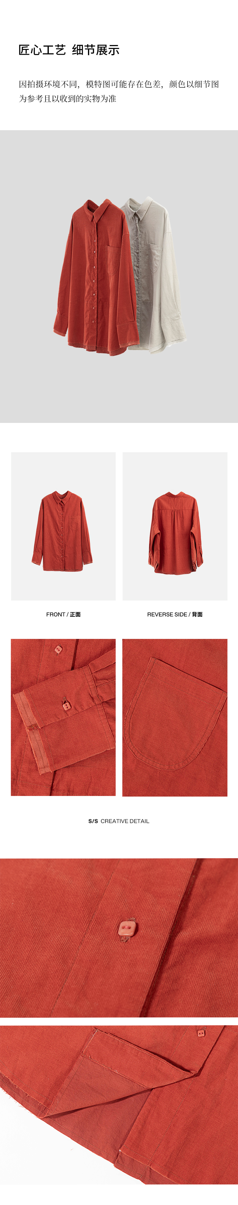 绽放588朵/匹马棉细条灯芯绒拼接宽松百搭翻领休闲长袖衬衫女秋冬