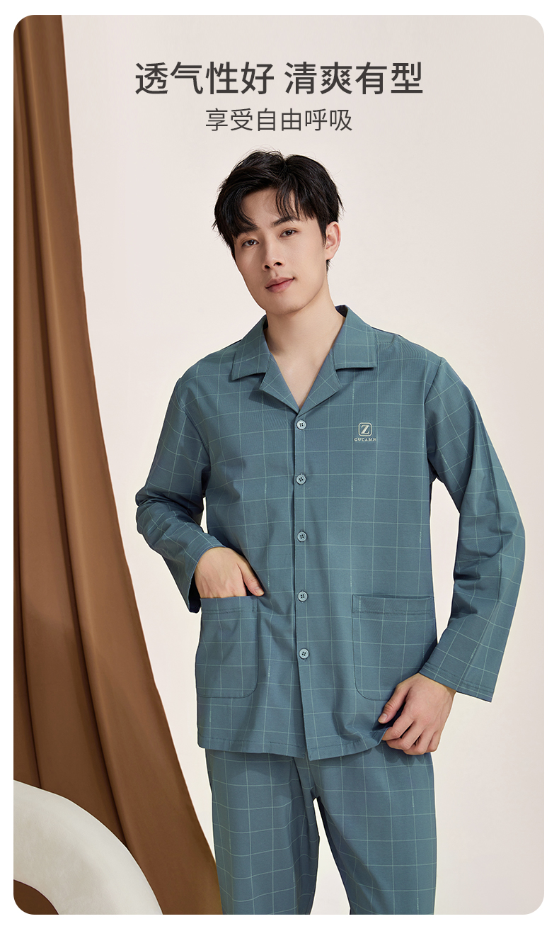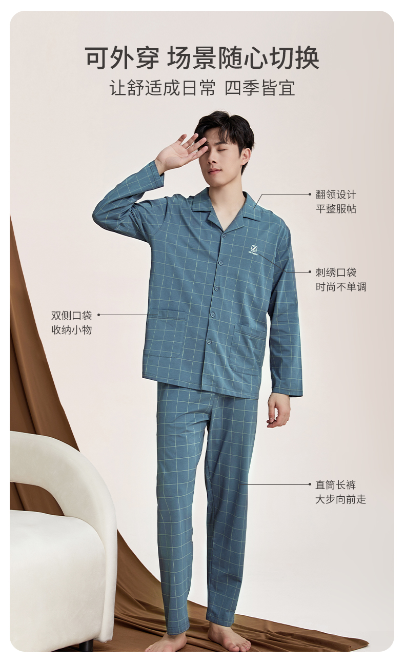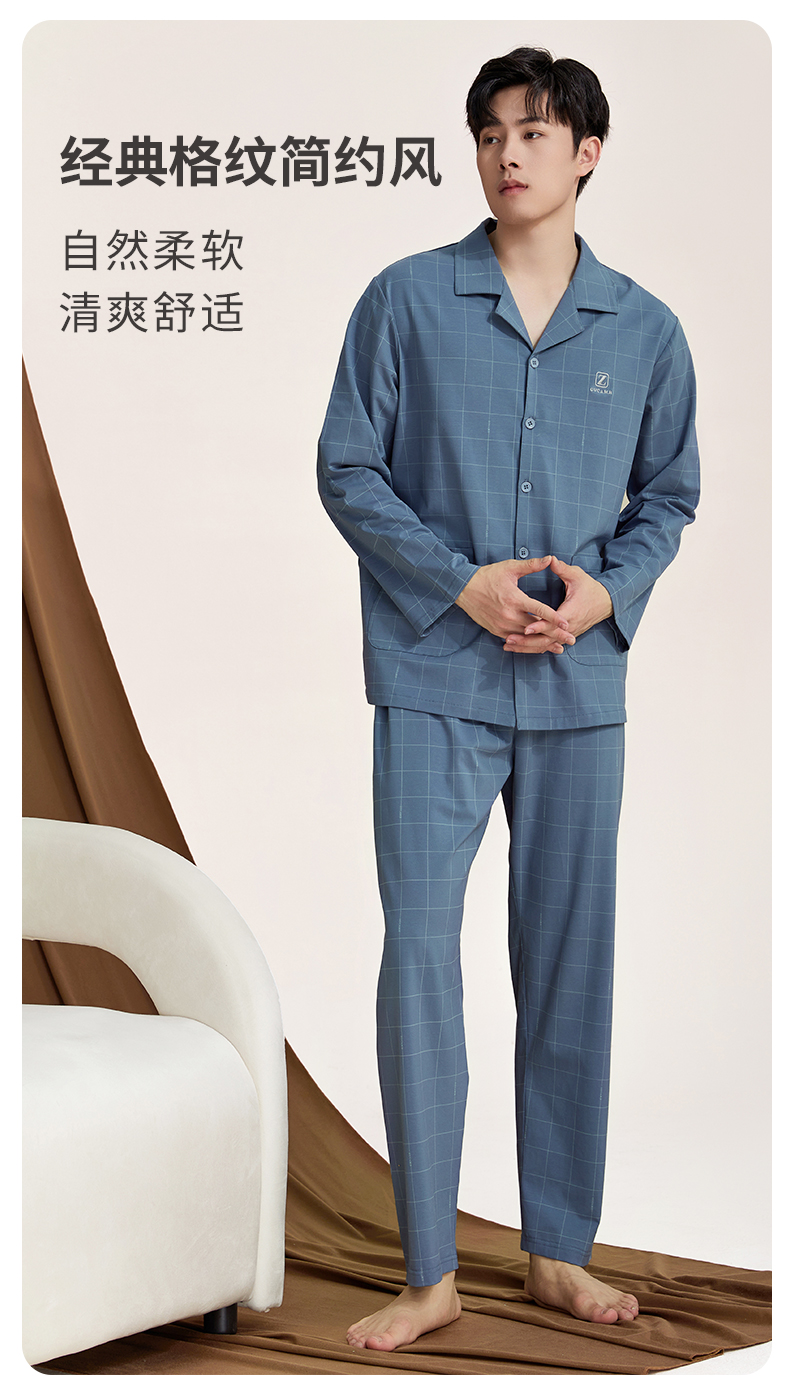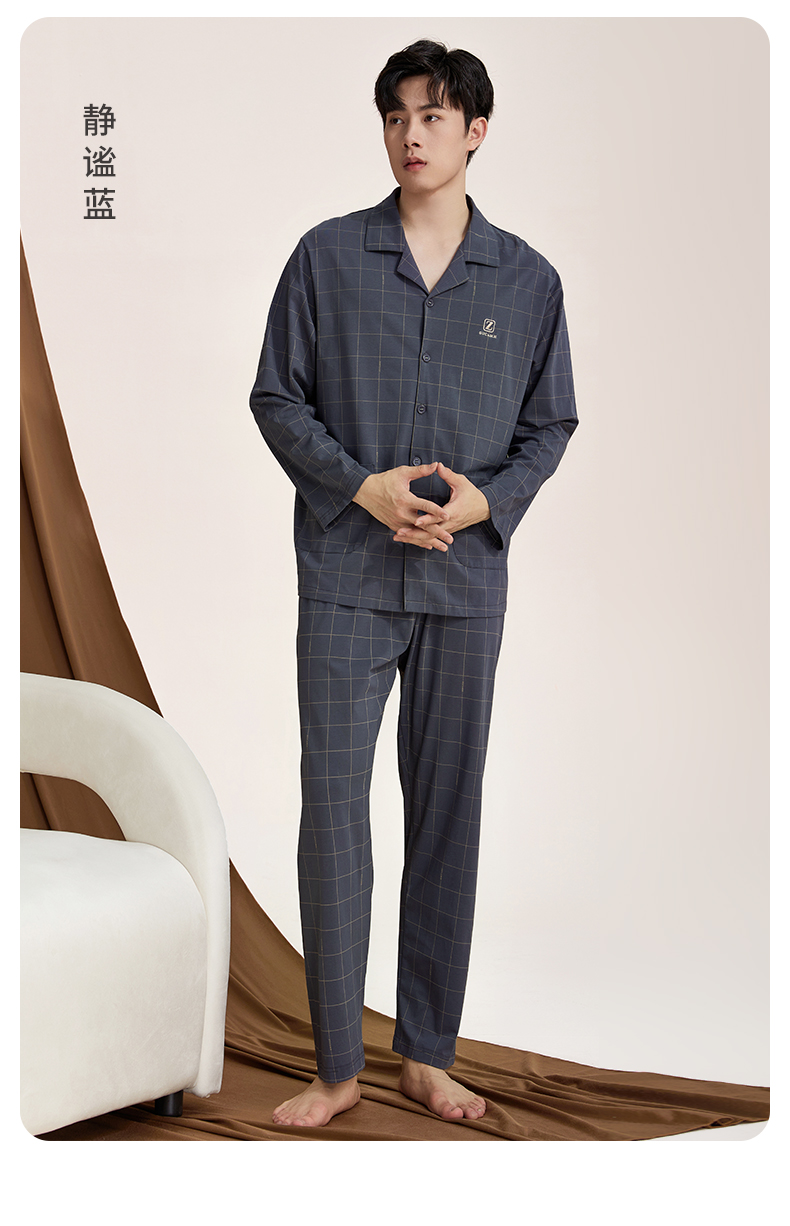 雅黛丽男士睡衣春秋款2024新款套装经典格纹休闲宽松可外穿家居服