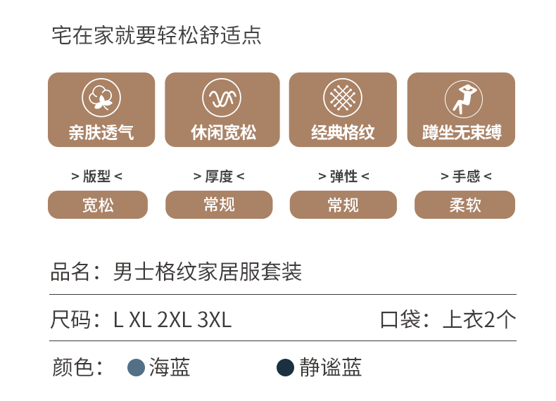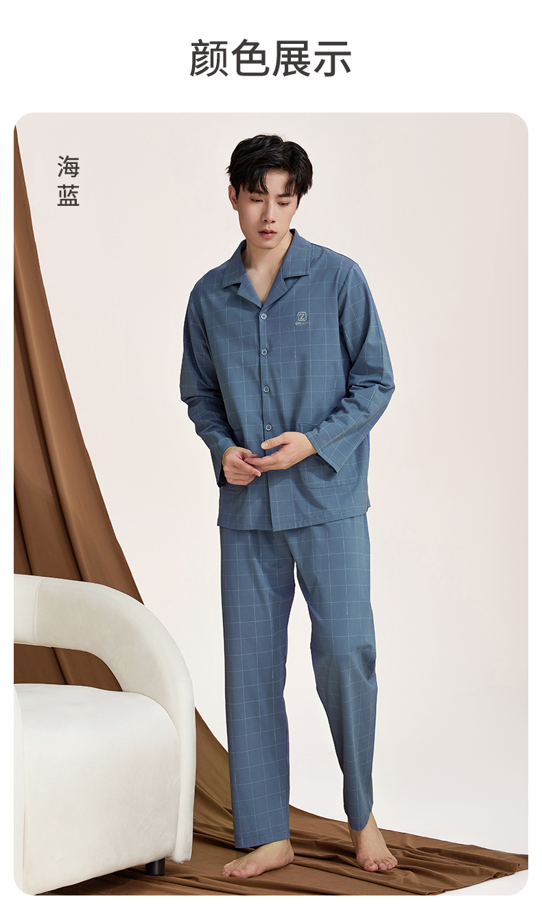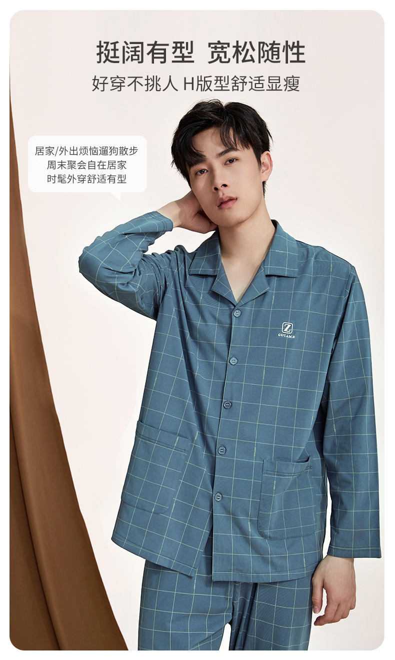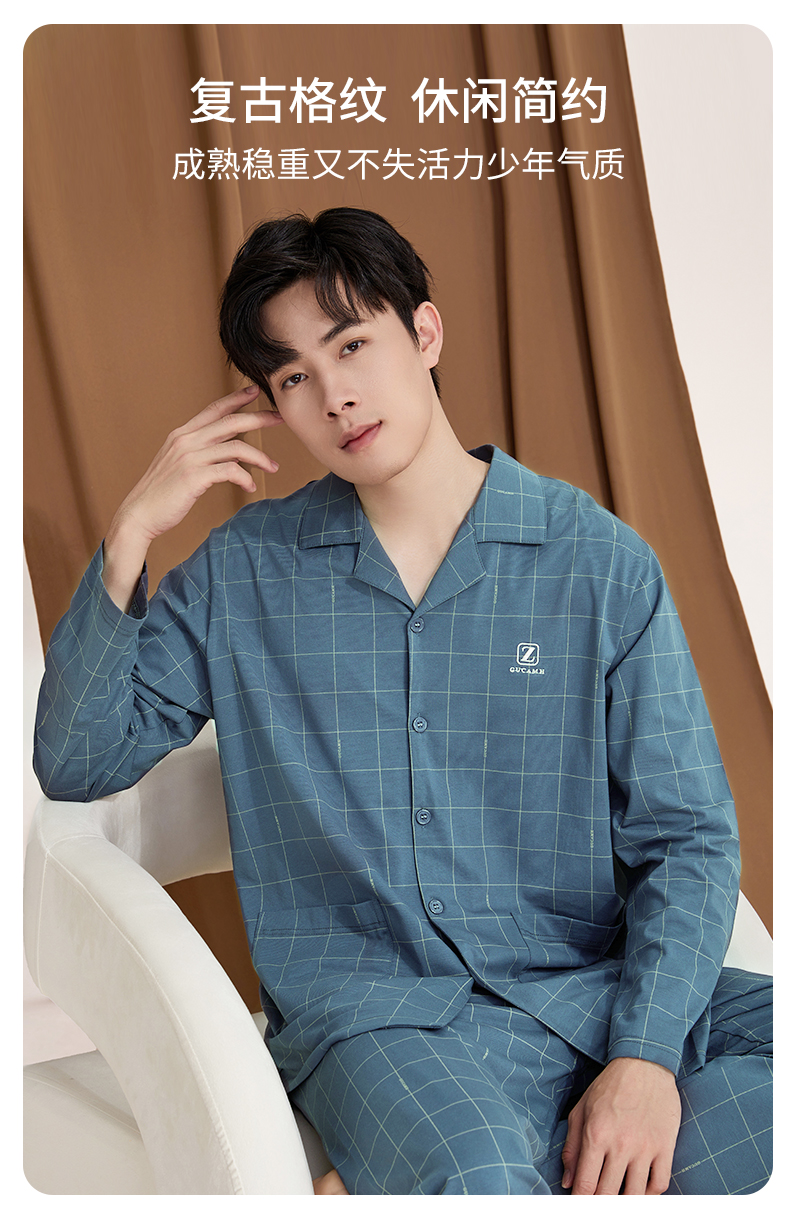雅黛丽男士睡衣春秋款2024新款套装经典格纹休闲宽松可外穿家居服