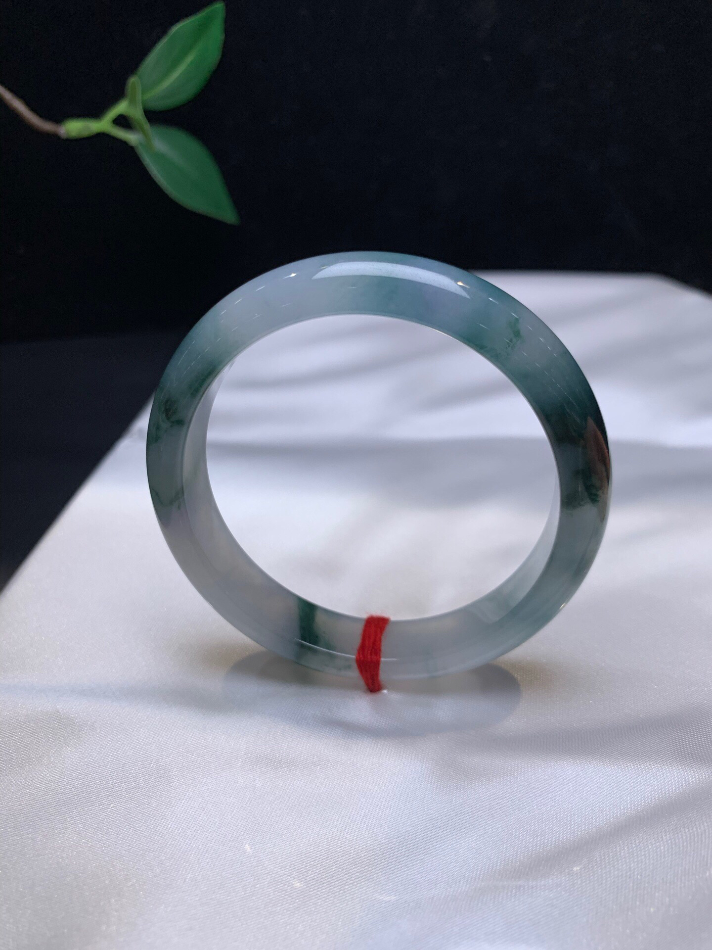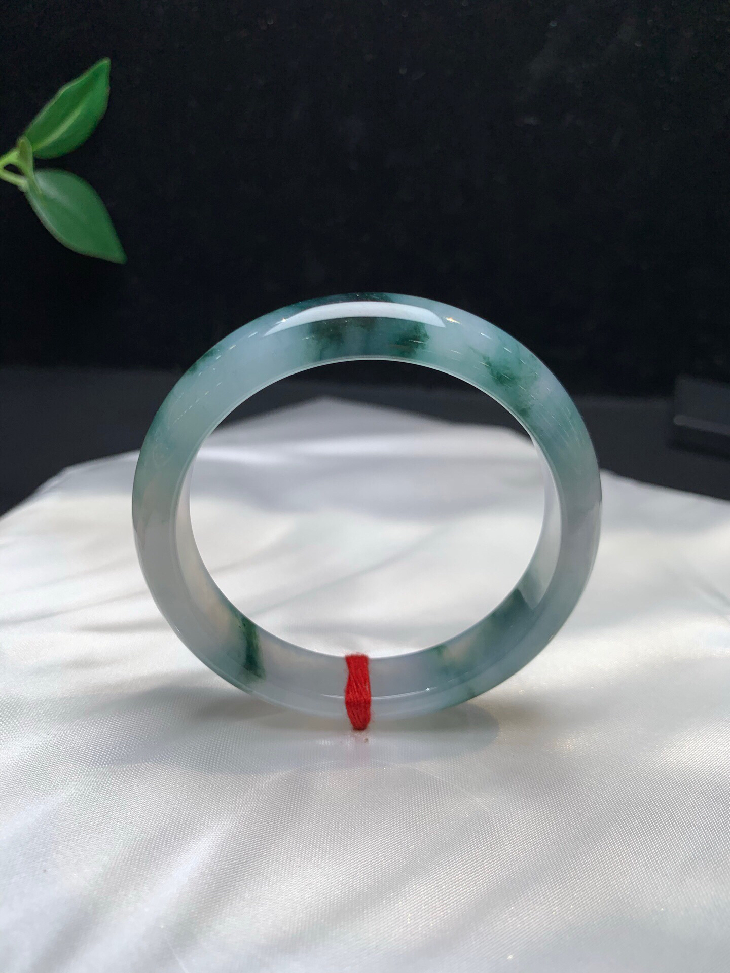 620711,55.3圈口,冰飘花正圈平安镯,老种,冰透起光,白底飘蓝花,条形秀气