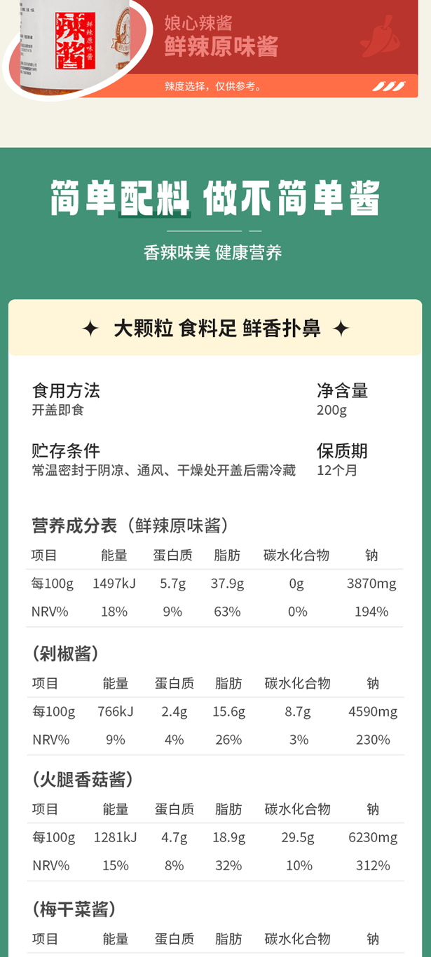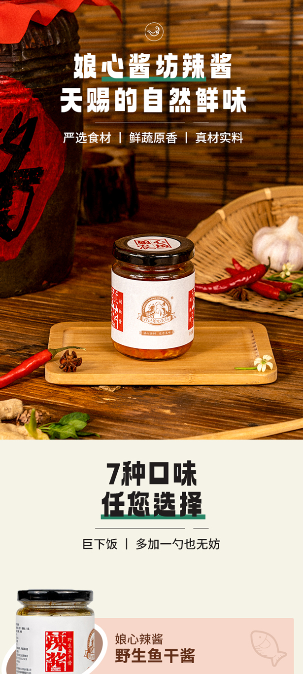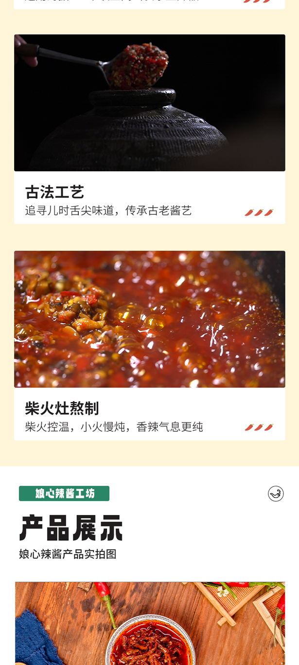 娘心辣酱制作主料:农家红辣椒、酱豆、大蒜、生姜、食盐、白糖、白酒等。