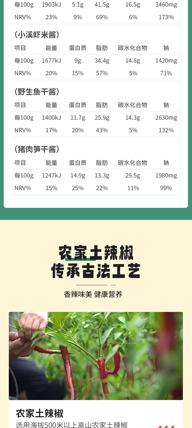 辣椒选用本地农家自然完熟的土红辣椒,酱豆采用自家发酵完整的“酱豆”。不添加其他食品添加剂。