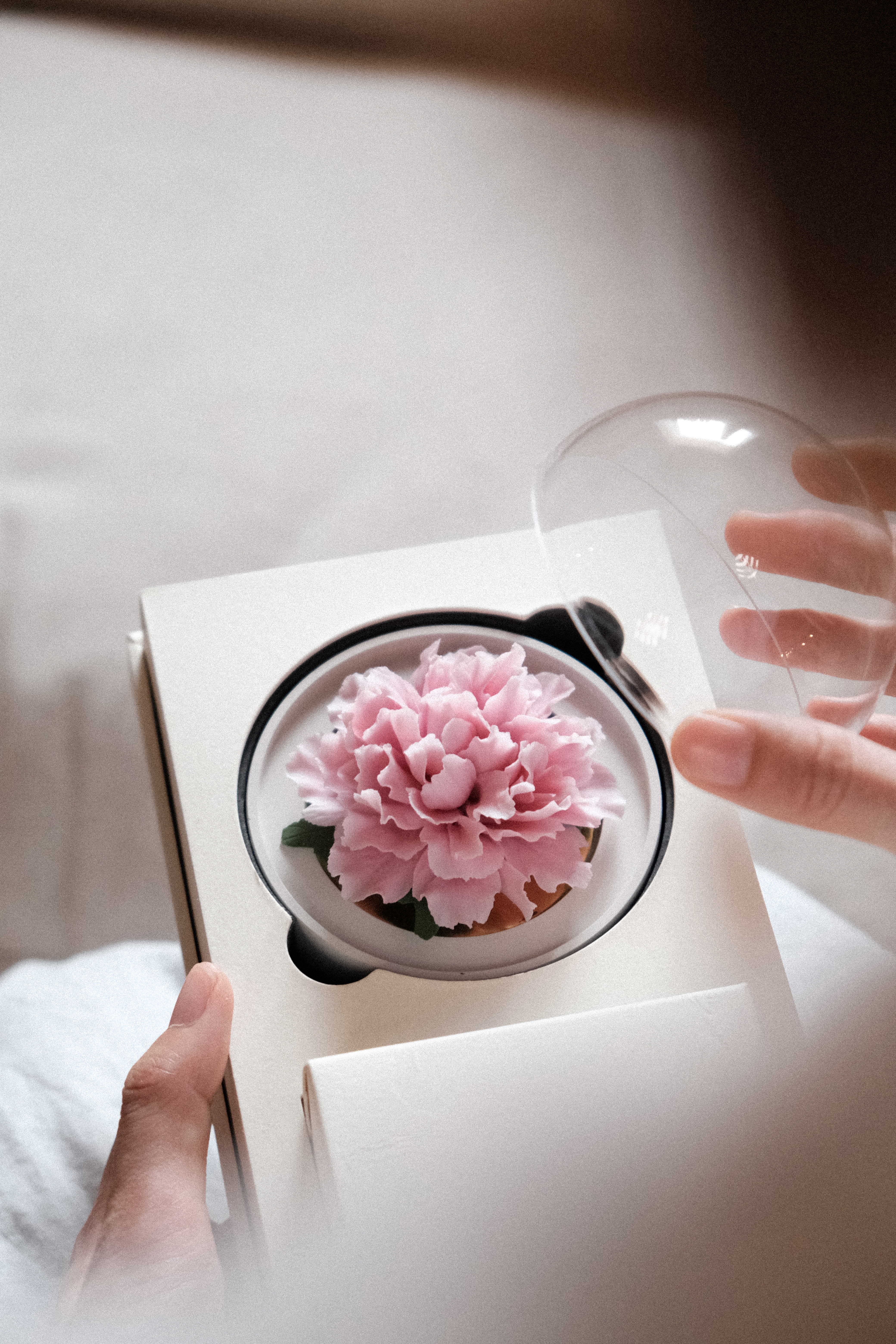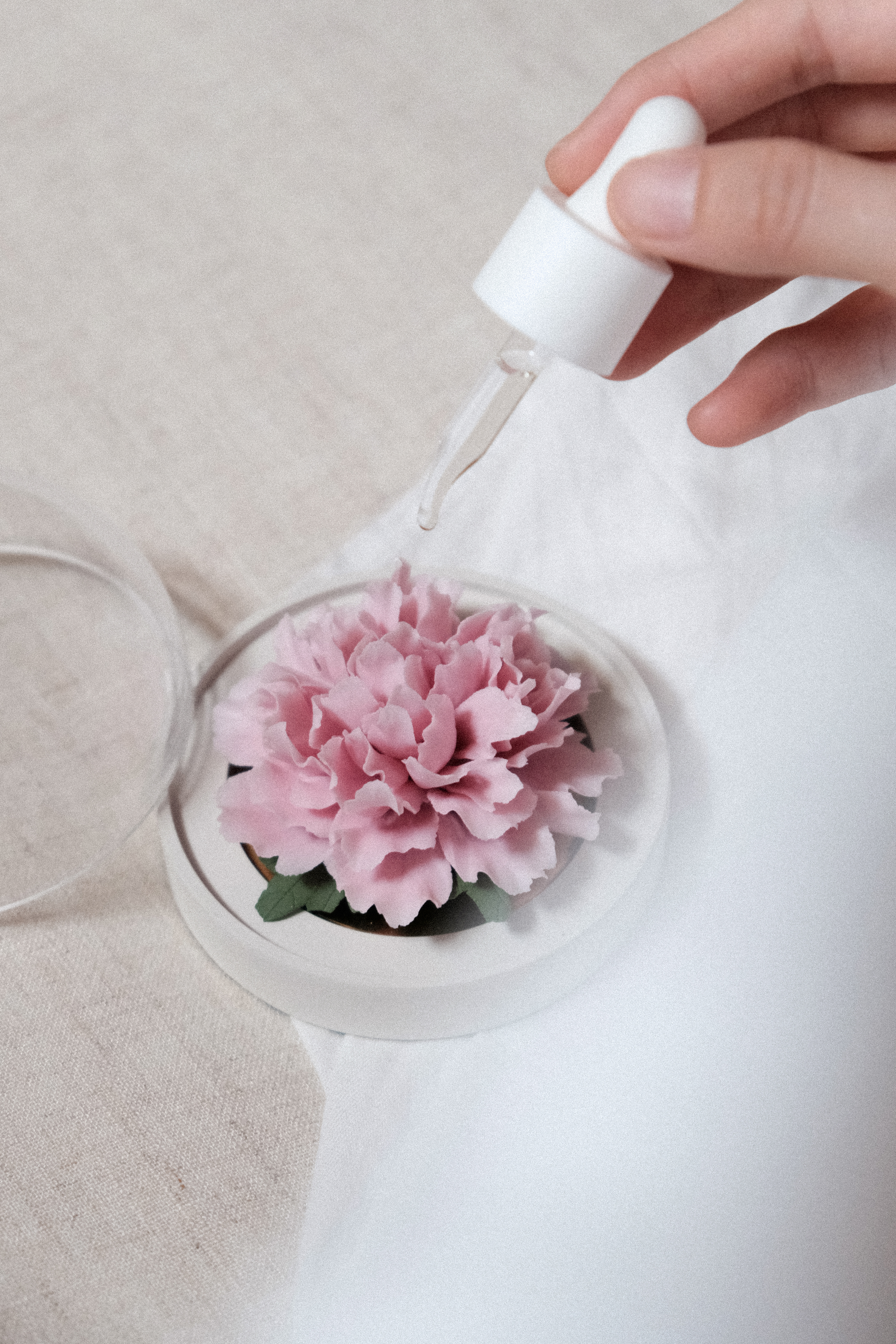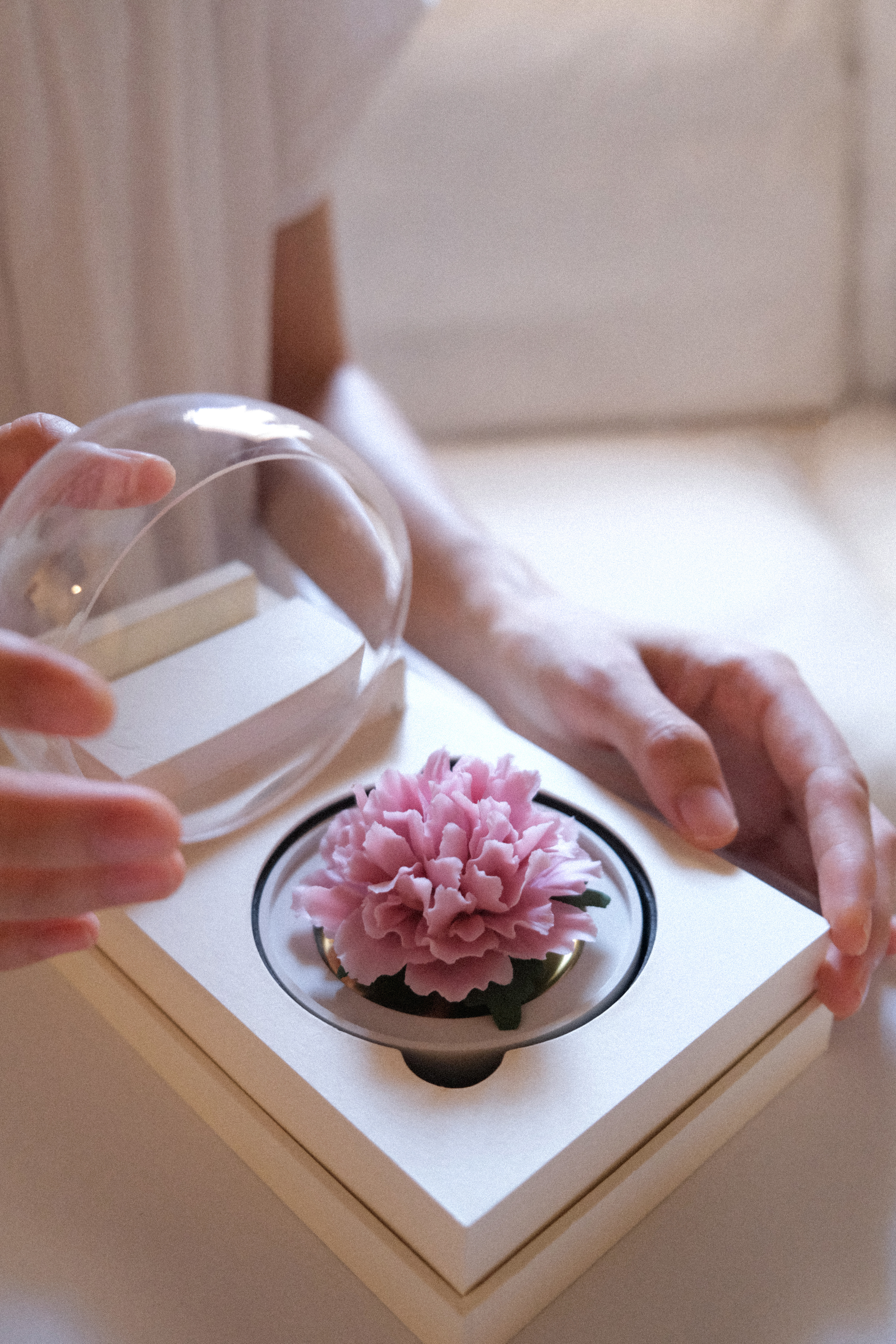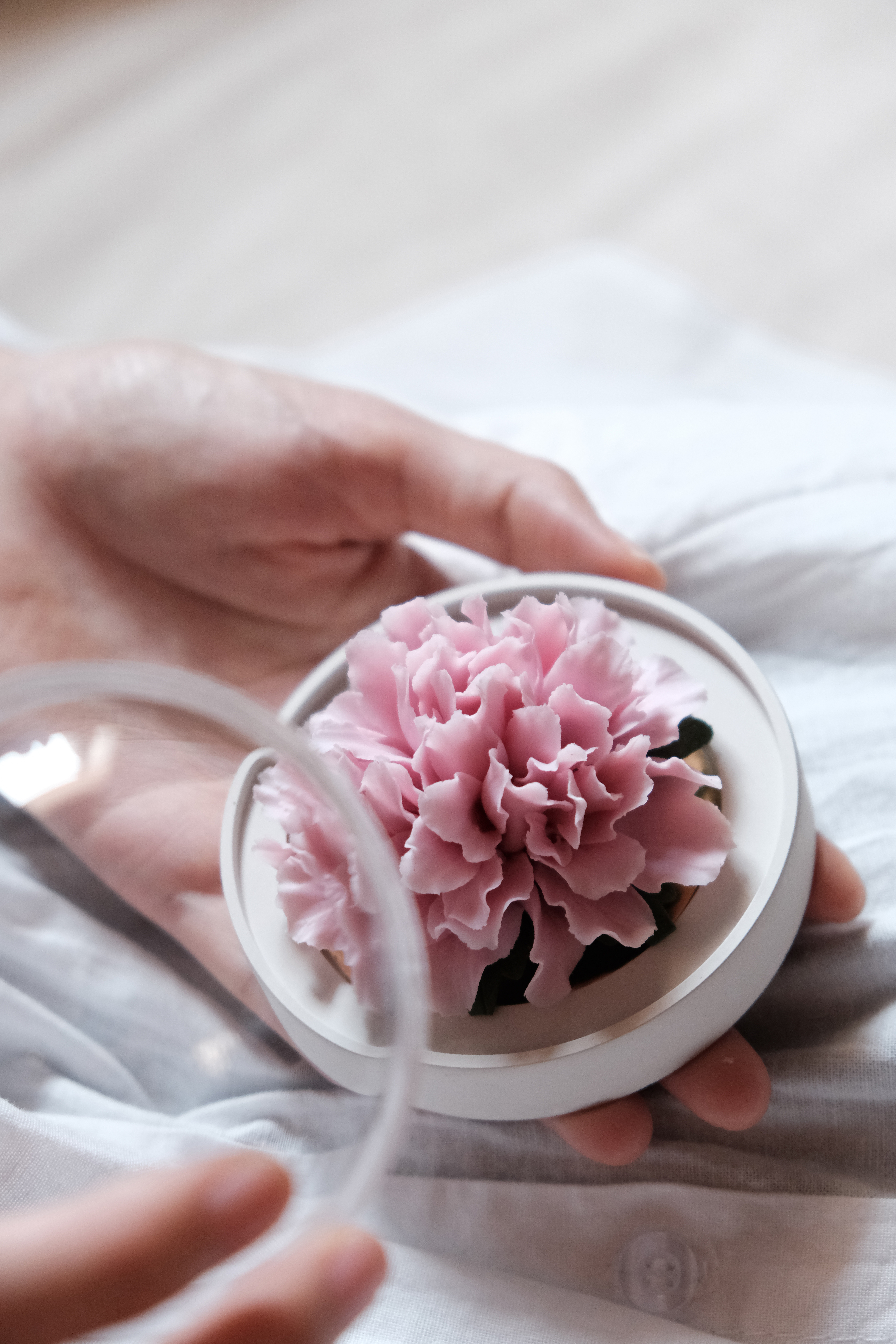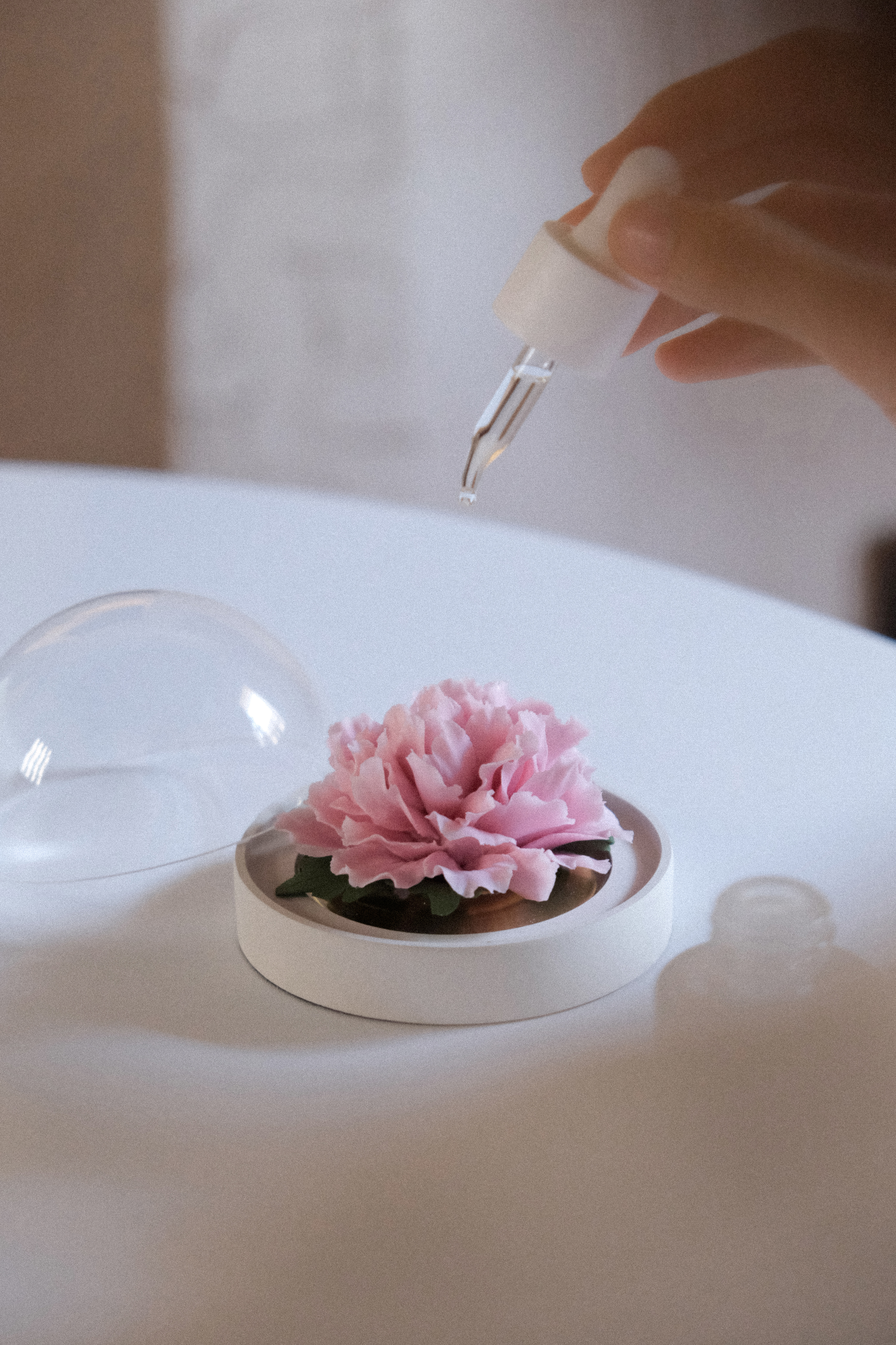 垂直向上取下防尘罩,往瓷花表面滴入4-5滴精油,盖上防尘罩静置12 小时后便可正常使用;