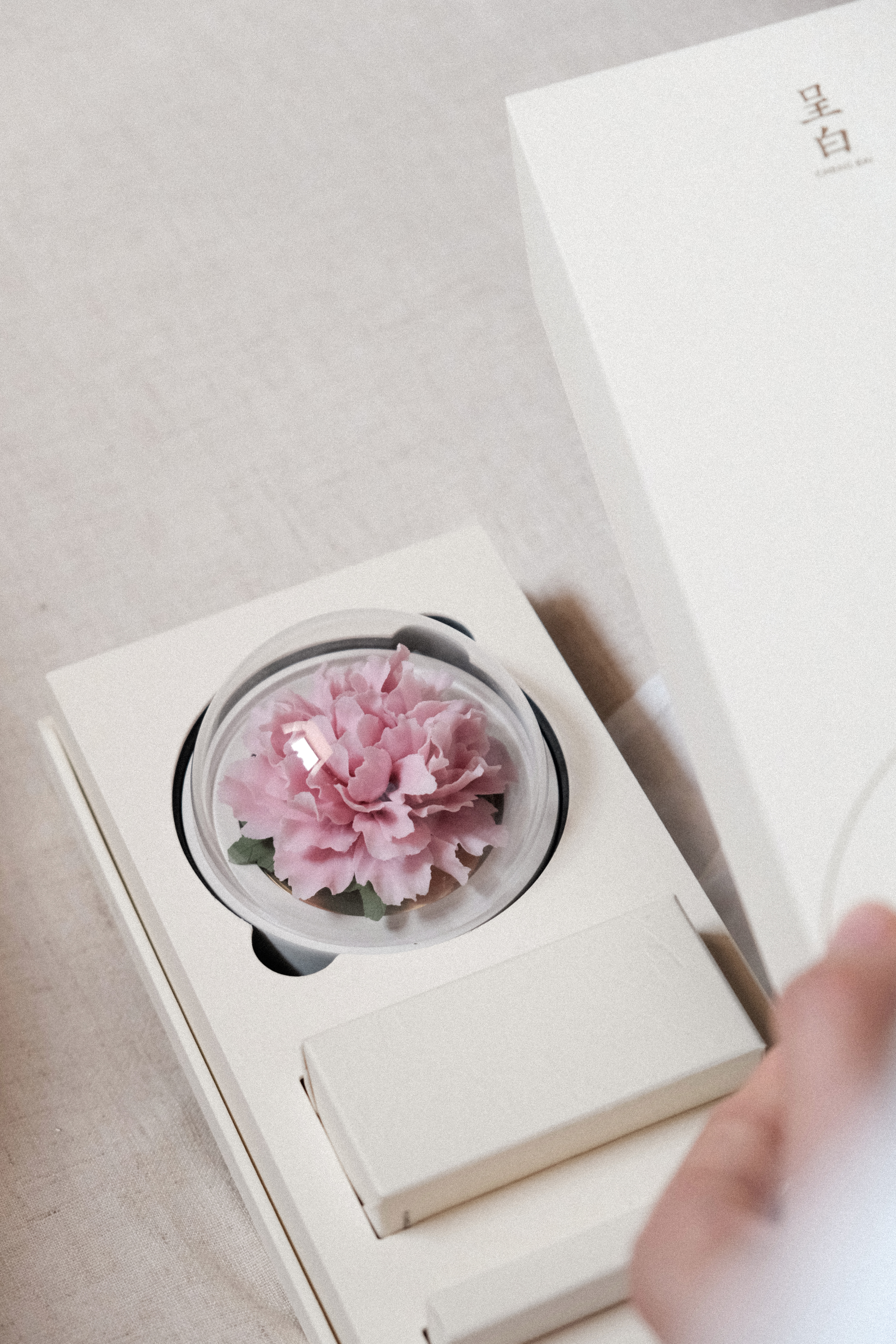 取下防尘罩,置于安全处,往瓷花表面小心滴入3-4滴精油便可开始拓香;