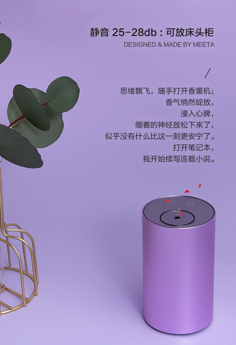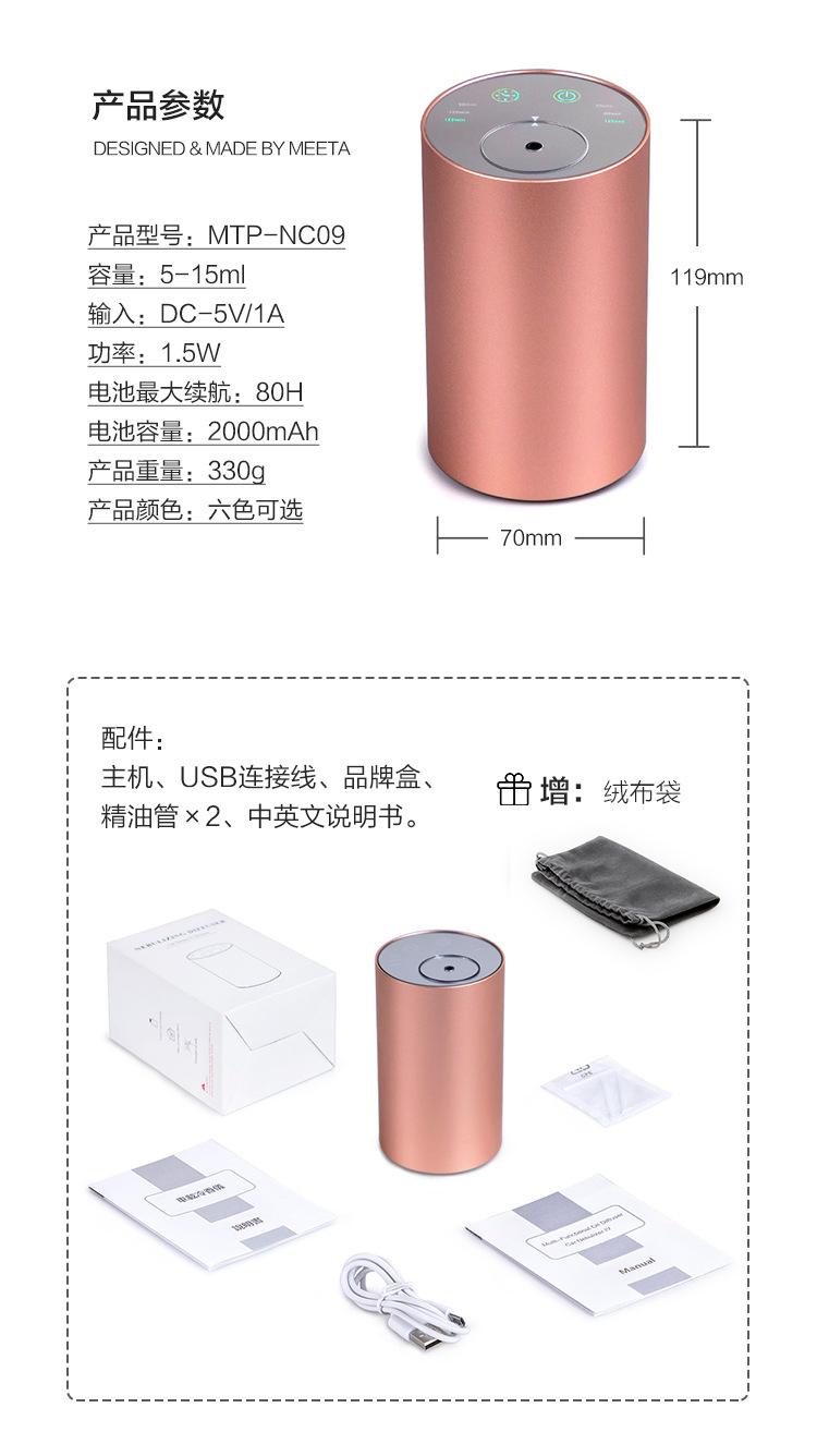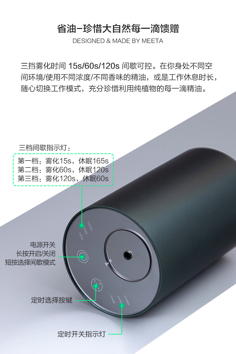 喷雾时间举例:机器有三个档位。装10ml精油的瓶子,机器一直开,小档可以持续喷香100小时,中档喷香50小时,快档33小时。可以定时关机。