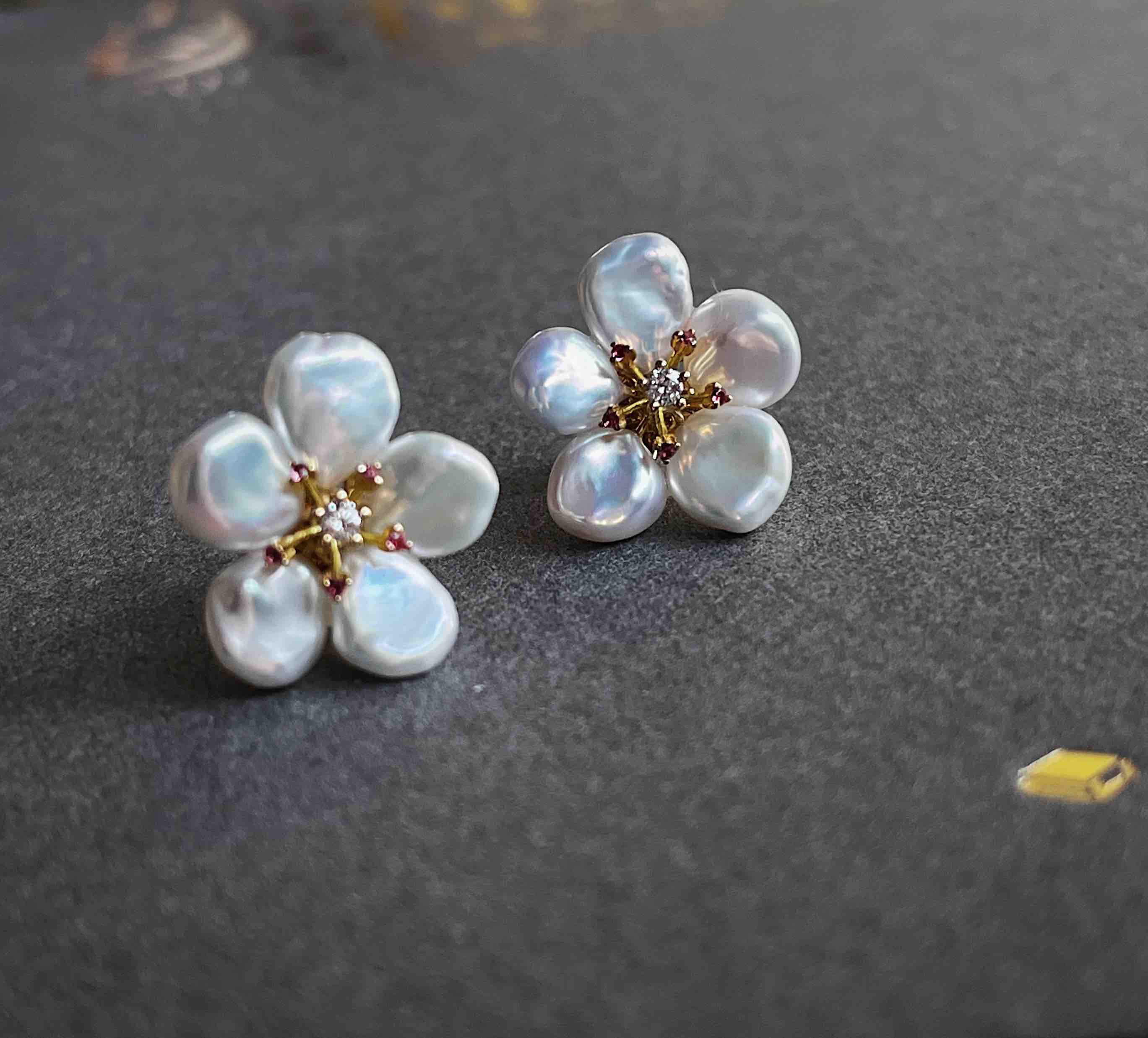 花语K金版 18K镶钻石、粉色蓝宝石和天然巴洛克形淡水珍珠耳钉