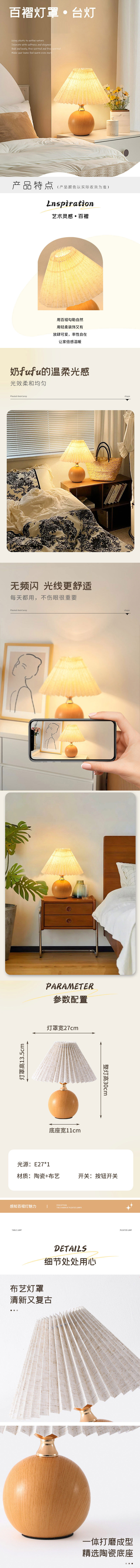 中式百褶陶瓷床头灯 复古北欧喂奶小夜灯