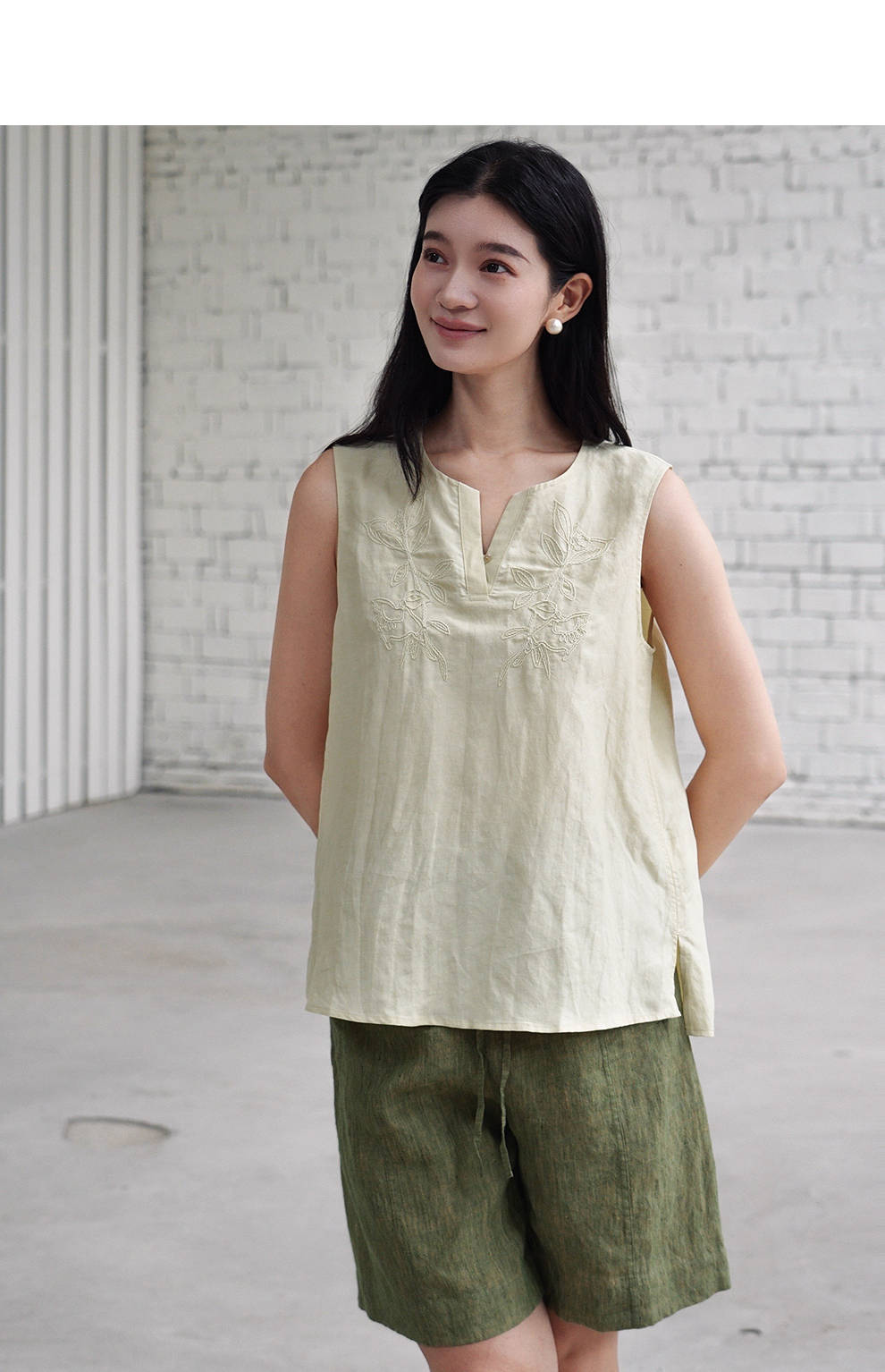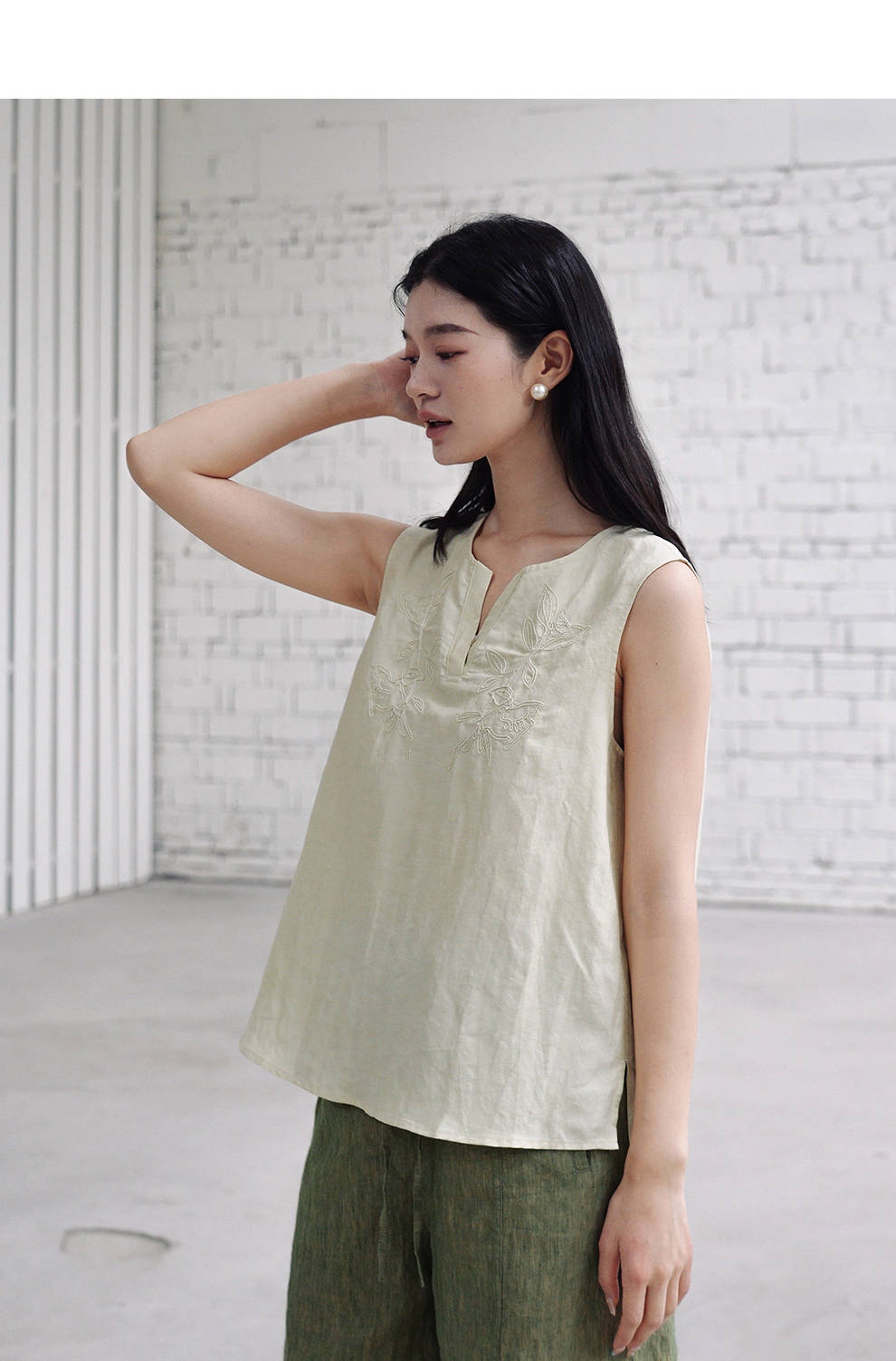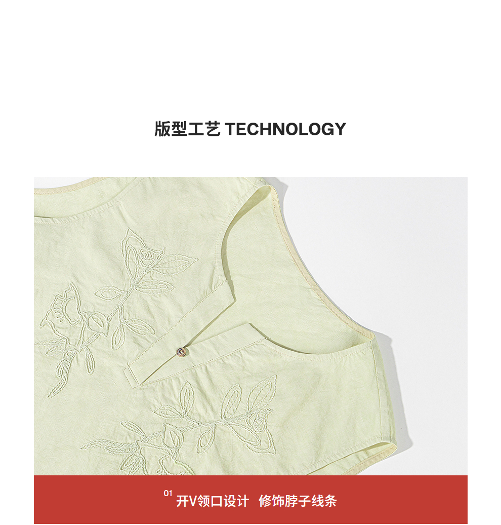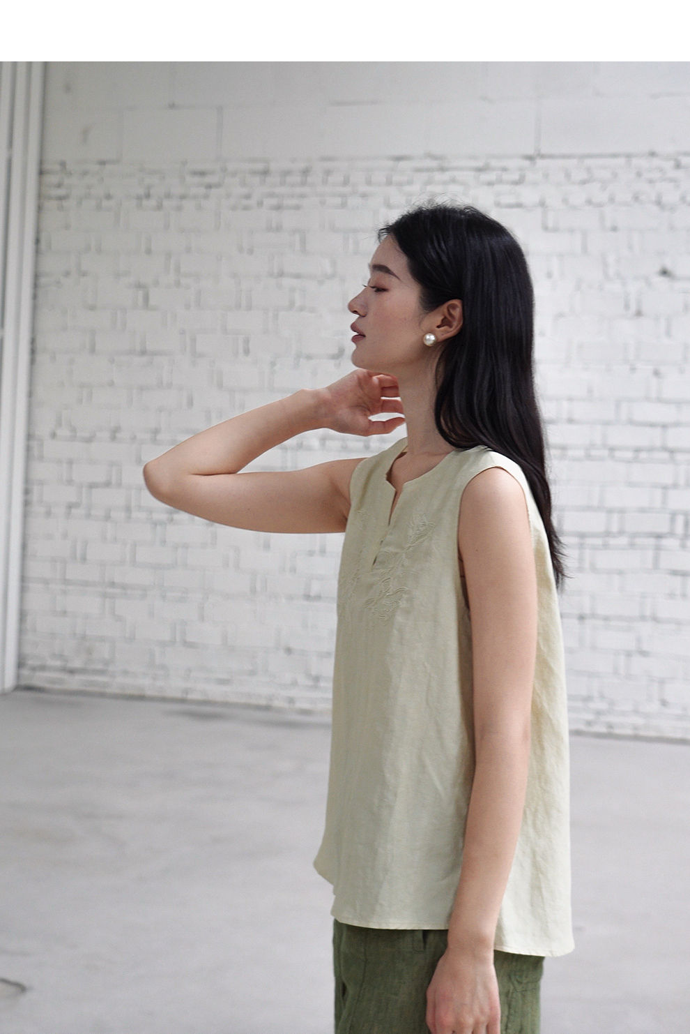 绽放315朵/【多巴胺系列·青柠】亚麻茶花盘带绣V领无袖背心吊带