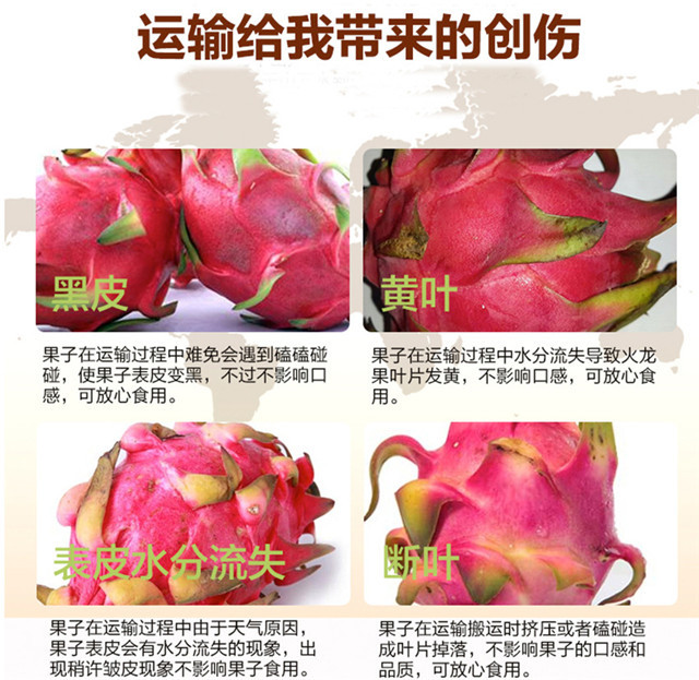 6)火龙果采摘后直接发货,果径部分含水分很足,打包后纸箱内外有温差,氧化过程会造成果子摘果剪口部分有腐烂现象,这种头部轻微腐烂属于正常现象,不参与售后;