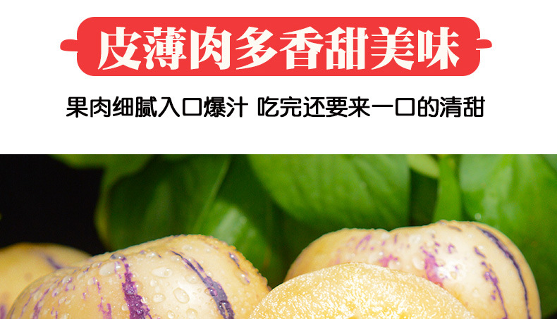 3、口感:淡雅悠香,清甜多汁,口感绵滑,如泉破涌,有淡奶油味,表皮紫纹相间受阳光直射为沙甜口感,表面黄色为脆甜,沙甜与脆甜口感皆佳;
