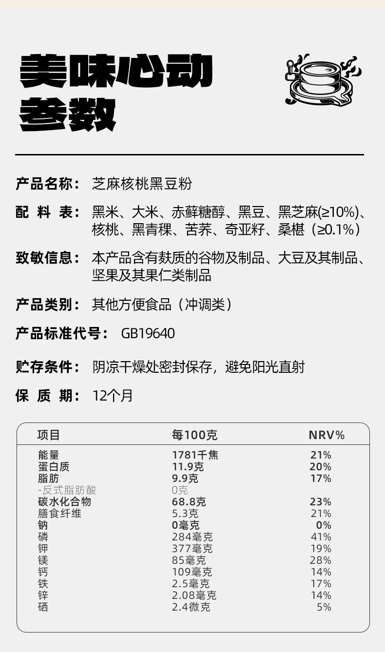早晨醒来,只要来一勺,缓缓倒入热水,边倒边轻轻搅拌,直至完全溶解一杯细腻顺滑、香气四溢的黑豆饮就完成了!它既有水水芝麻的轻盈口感,又融合了黑豆的醇厚、核桃的细腻香浓,随后是麸炒山药的温暖与黑桑葚的清甜,超好喝!如果想要来碗稠厚的糊糊,就多来两勺,口感更是香浓!