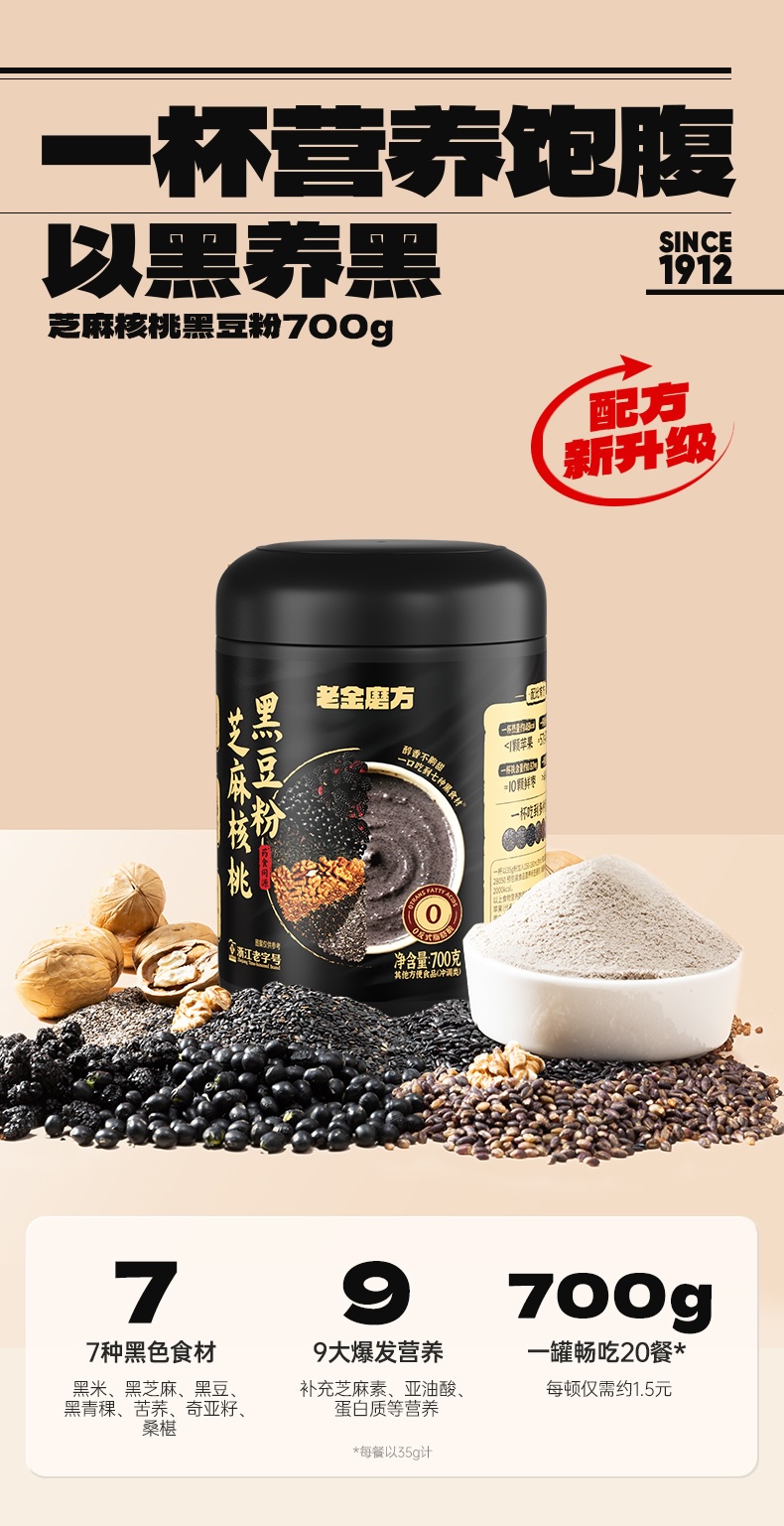 [屁侠推荐]老金磨方 黑芝麻核桃黑豆粉 700g 无蔗糖芝麻黑豆粉 营养早餐代餐(配方已升级)