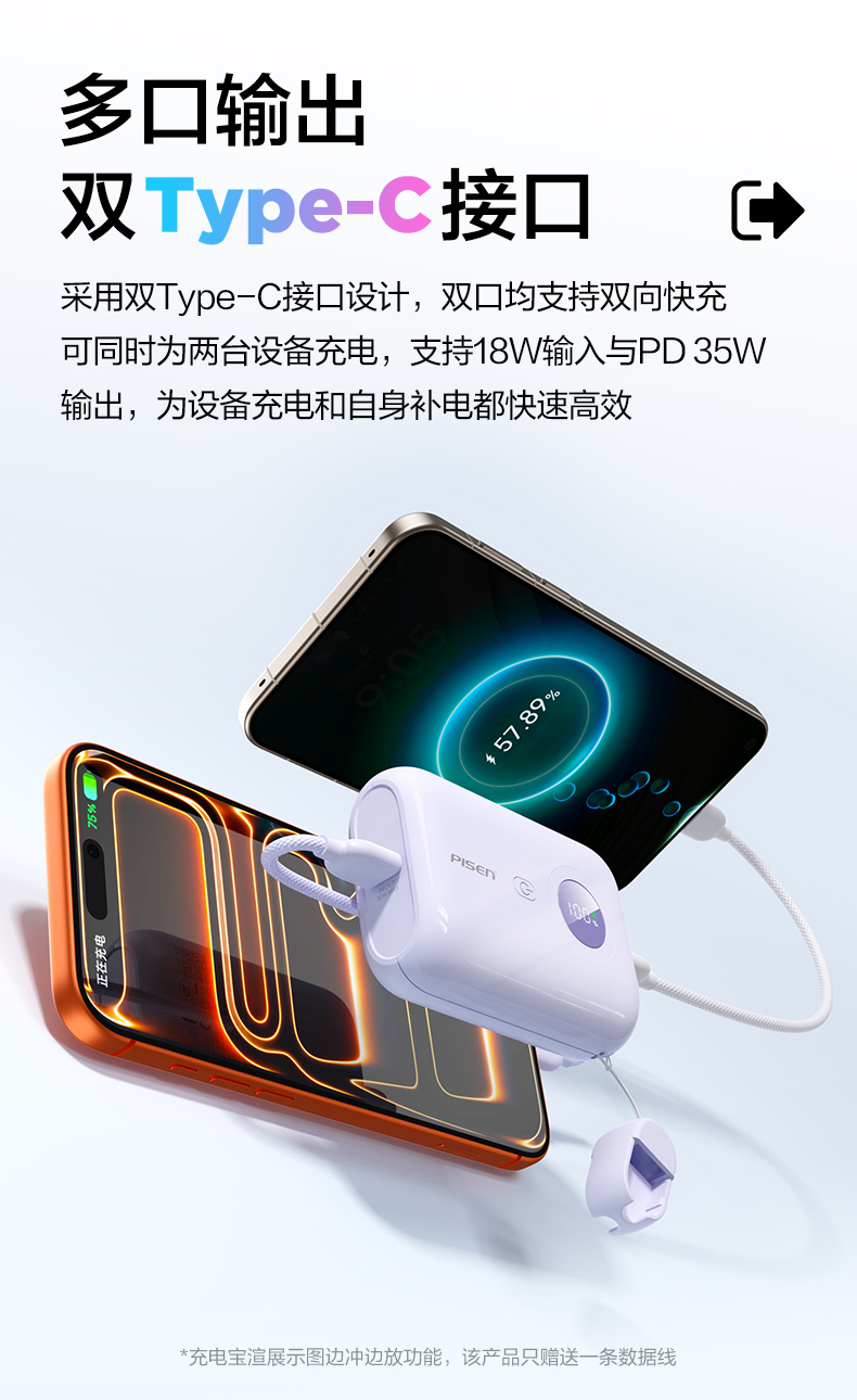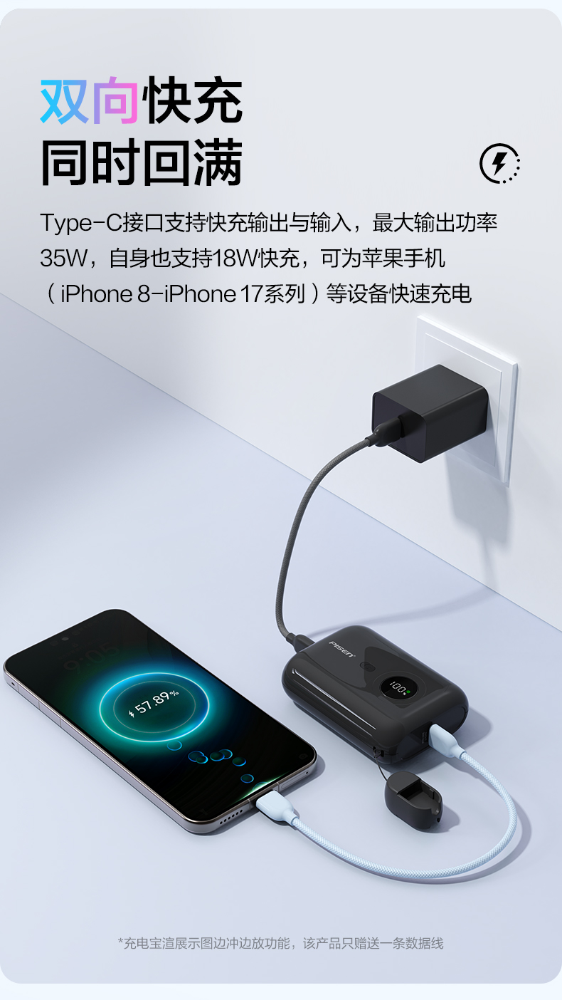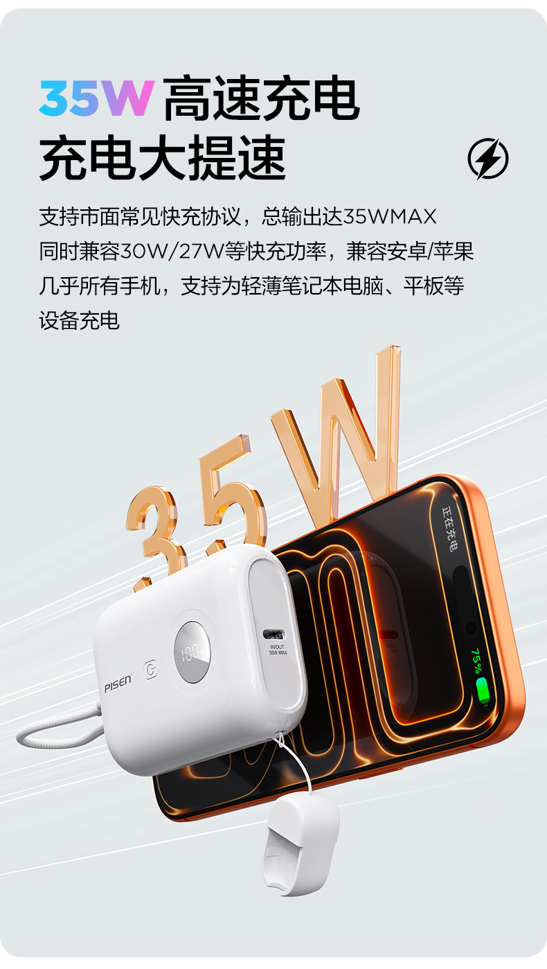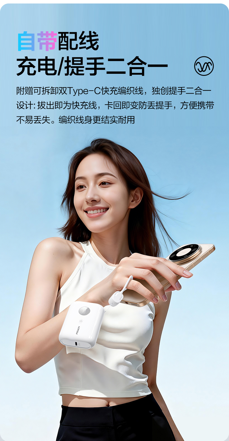 品胜35W Mini便携自带线充电宝10000毫安 自带Type-C双线输出移动电源支持快充苹果/华为/小米荣耀等设备