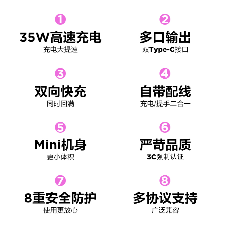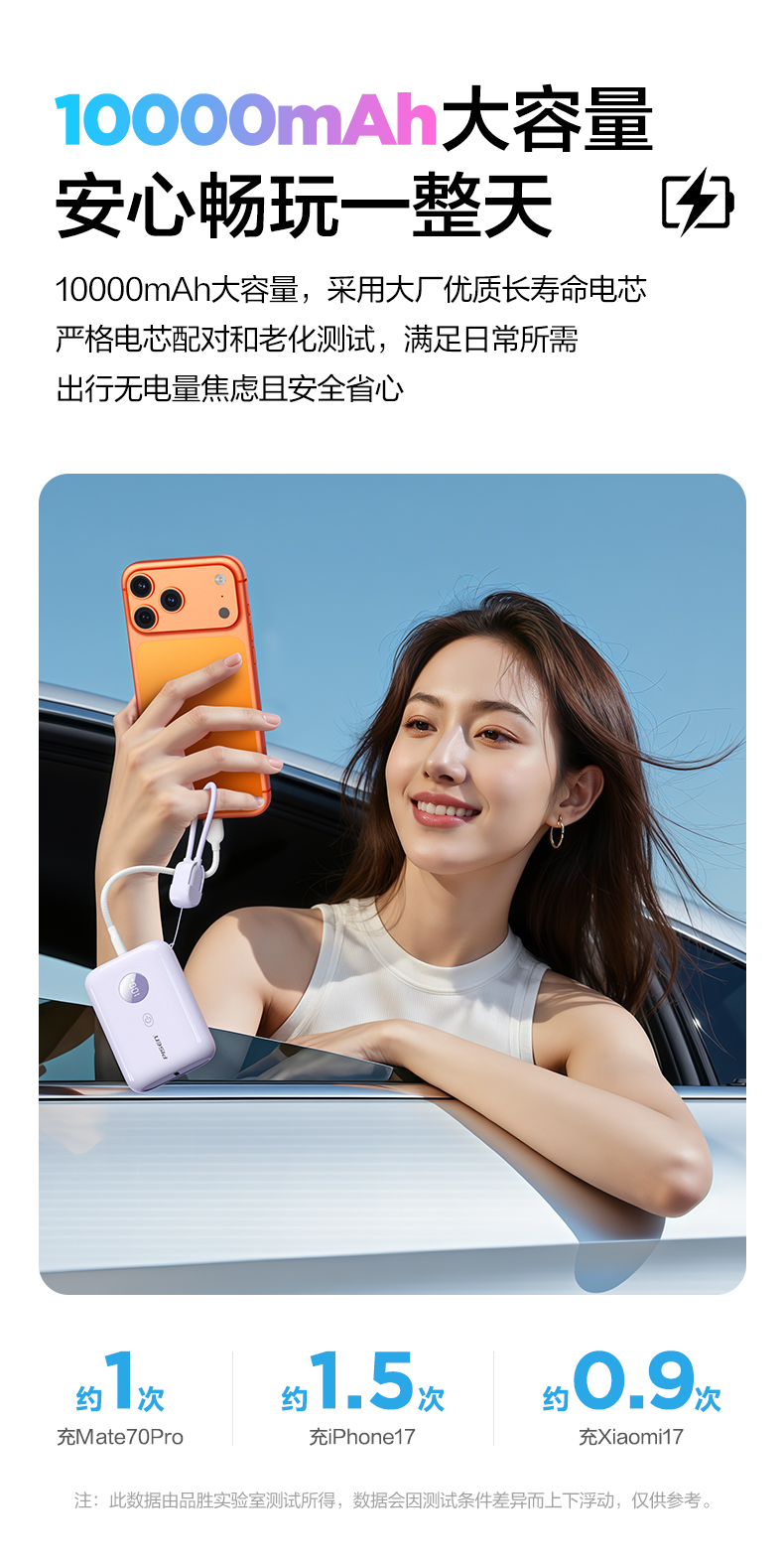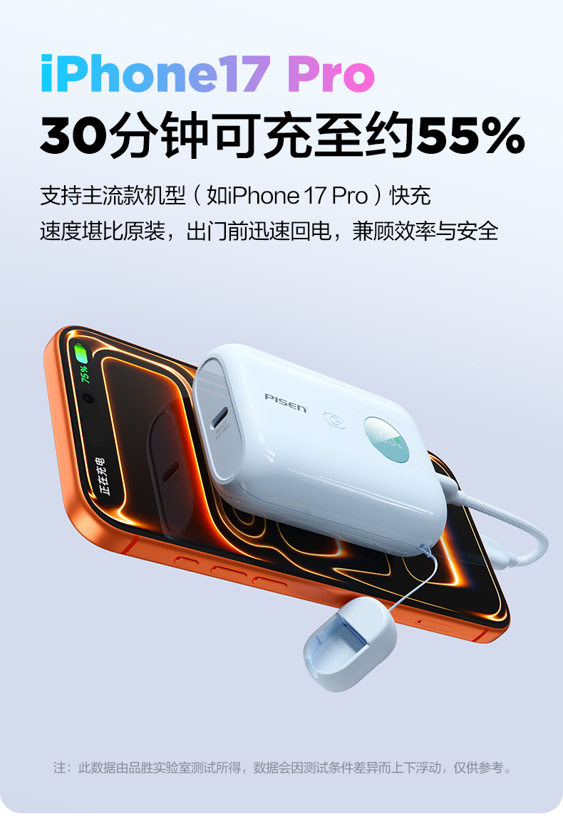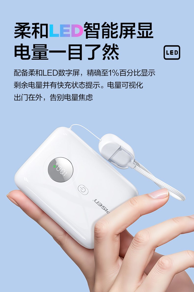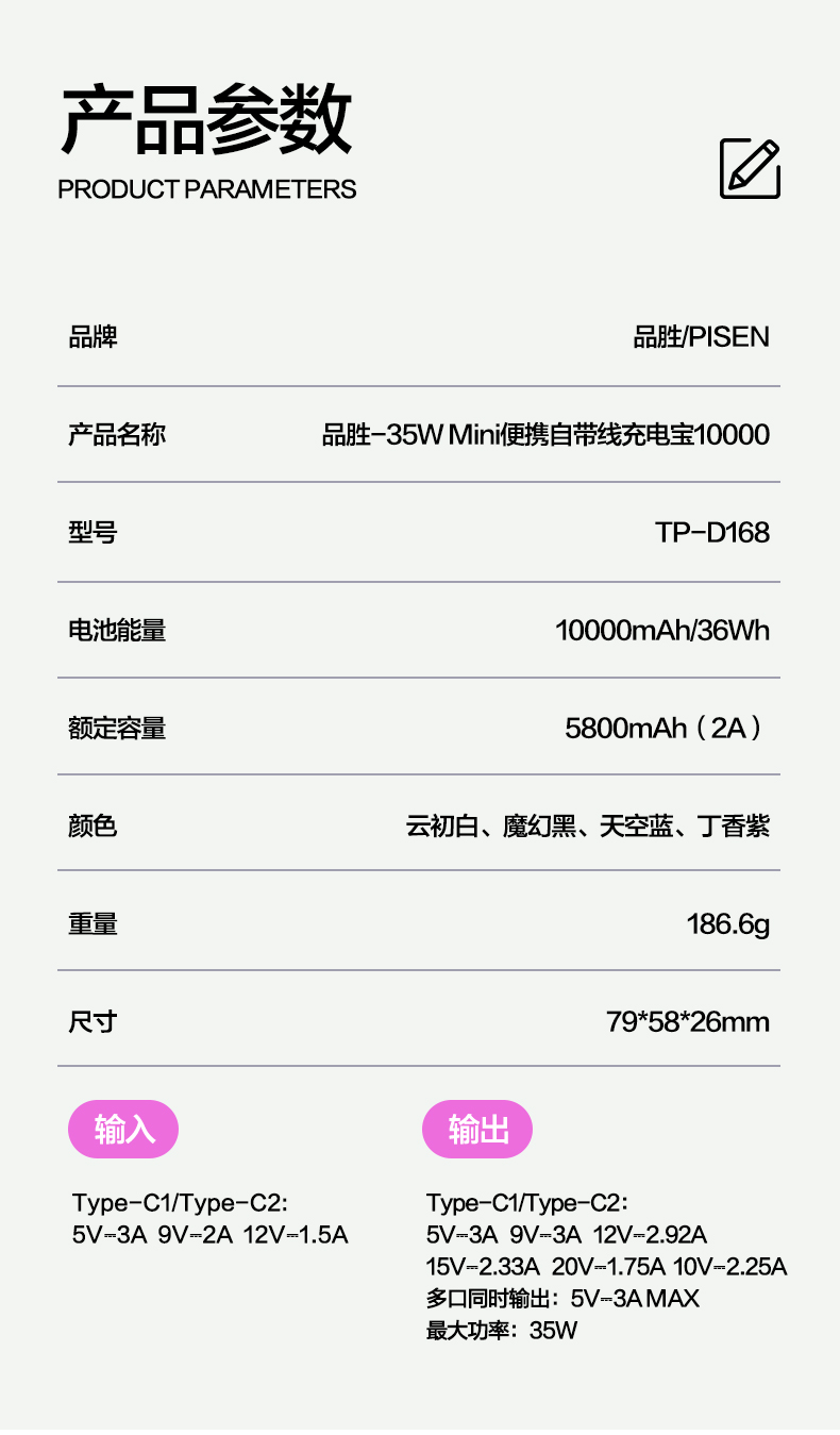 品胜35W Mini便携自带线充电宝10000毫安 自带Type-C双线输出移动电源支持快充苹果/华为/小米荣耀等设备