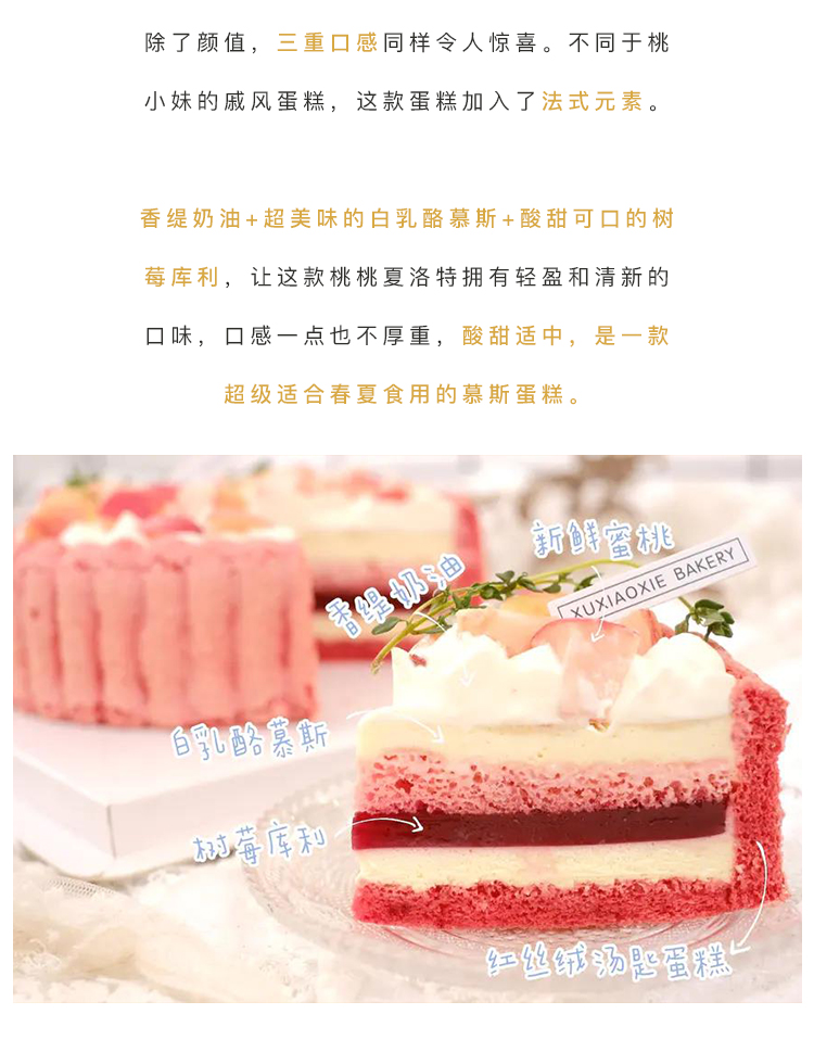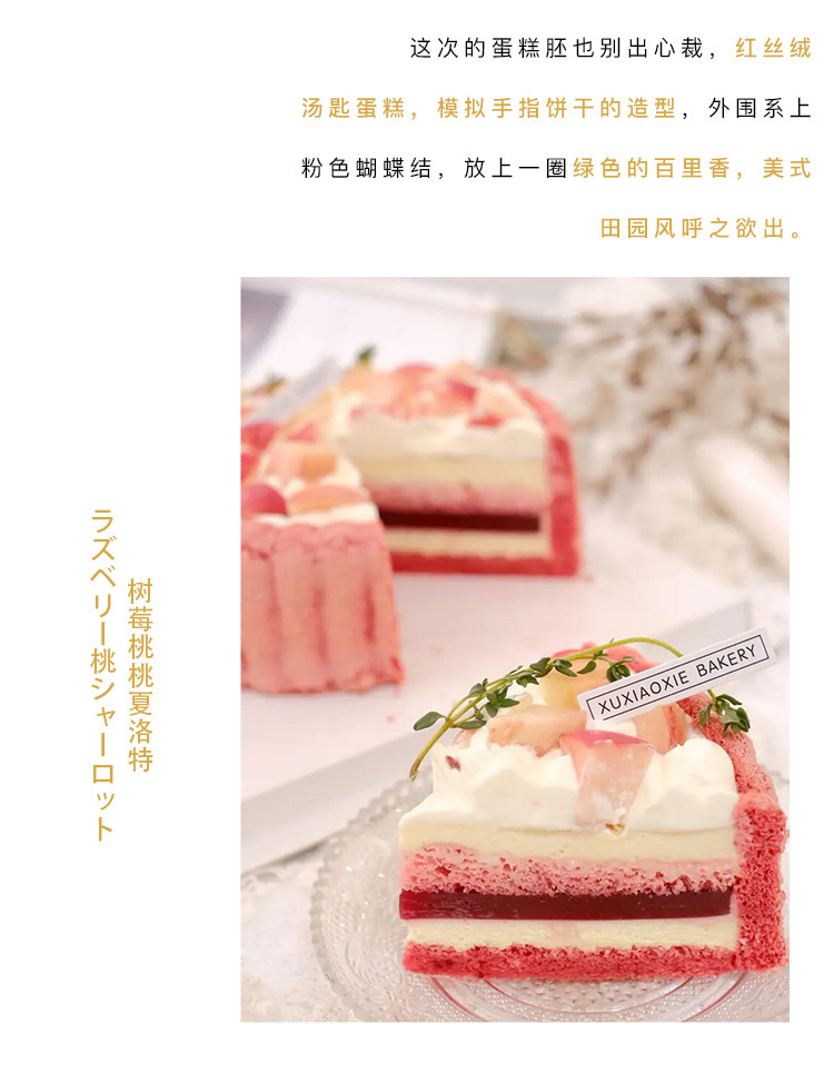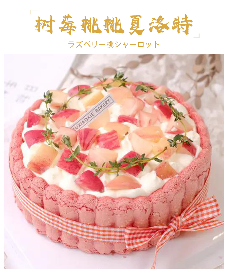 树莓夏洛特︳香缇奶油+白乳酪慕斯+树莓库利+红丝绒汤匙蛋糕,表面 装饰水蜜桃
