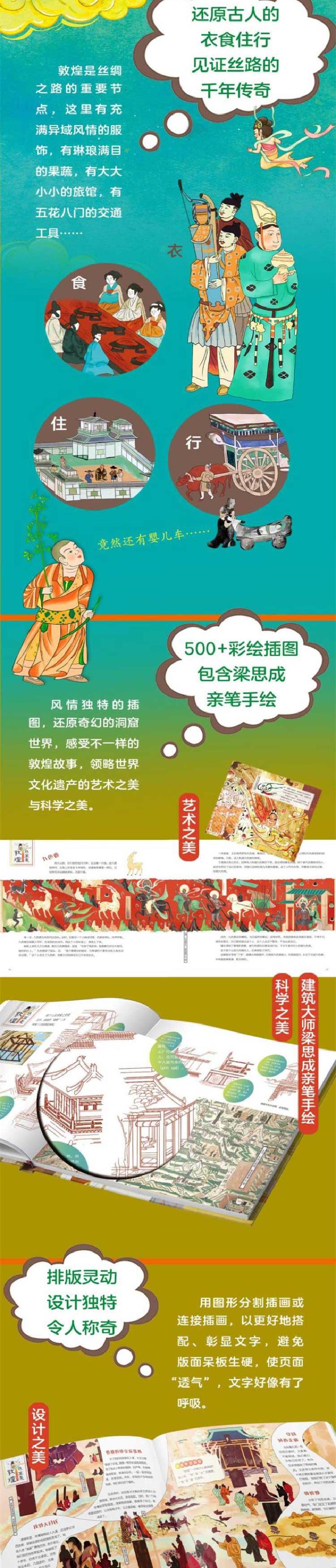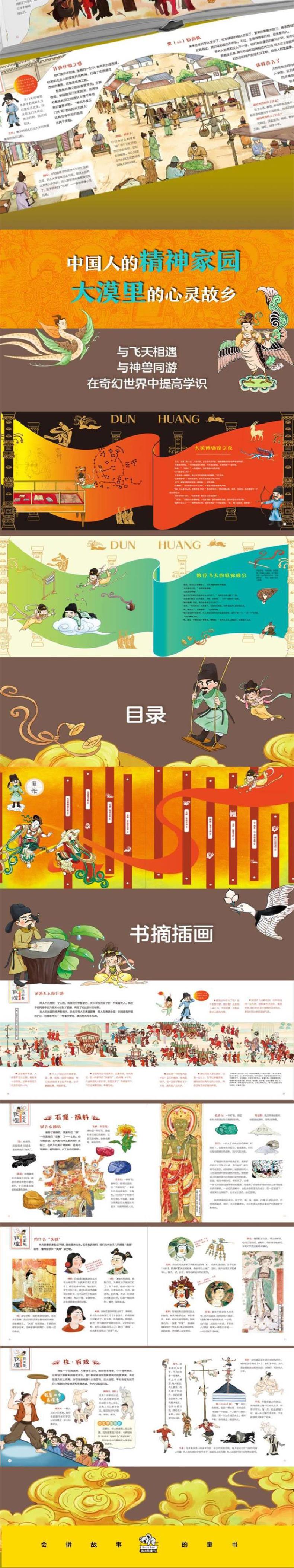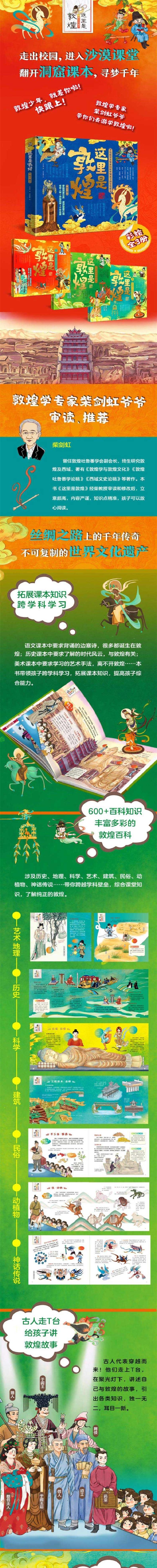 本套书《这里是敦煌》共分为三册,**册主要描述了敦煌诞生及发展的历史,第二册主要描述了敦煌修筑及壁画上的科技故事,第三册主要描述敦煌丝绸之路上的故事。这三册内容丰富多彩,故事生动有趣,可以让小读者在轻松阅读中了解敦煌的前世今生,掌握博大精深的百科知识,并感受到中华文化的魅力,增强民族自豪感。全书采用了大量敦煌壁画,色彩艳丽,冲击力强,能让小读者感受到一种与众不同的风情,不仅丰富自己对敦煌文化的理解,还能在不知不觉间提高艺术鉴赏力和审美力。