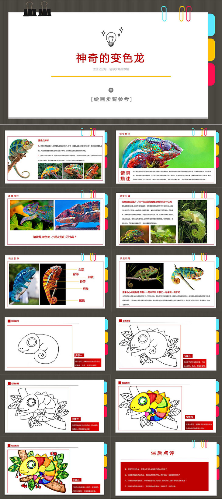 1、欣赏变色龙的图片,了解变色龙的趣味知识,并说一说变色龙哪些方面很神奇呢? 我们在了解变色龙后,用流畅的线条将变色龙的外形画下来吧,注意体现出变色龙的外形特点哦。