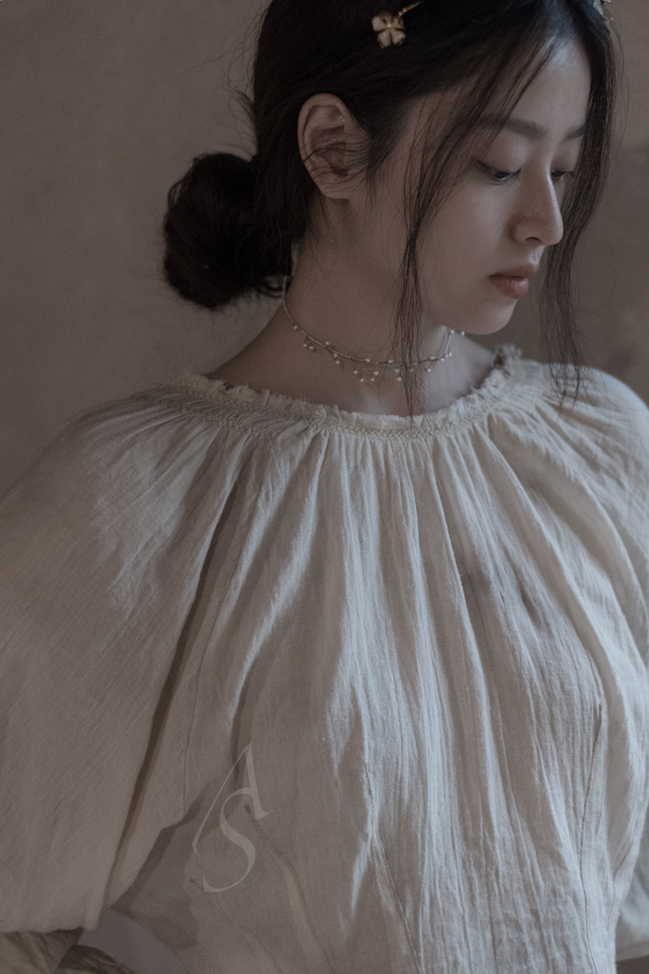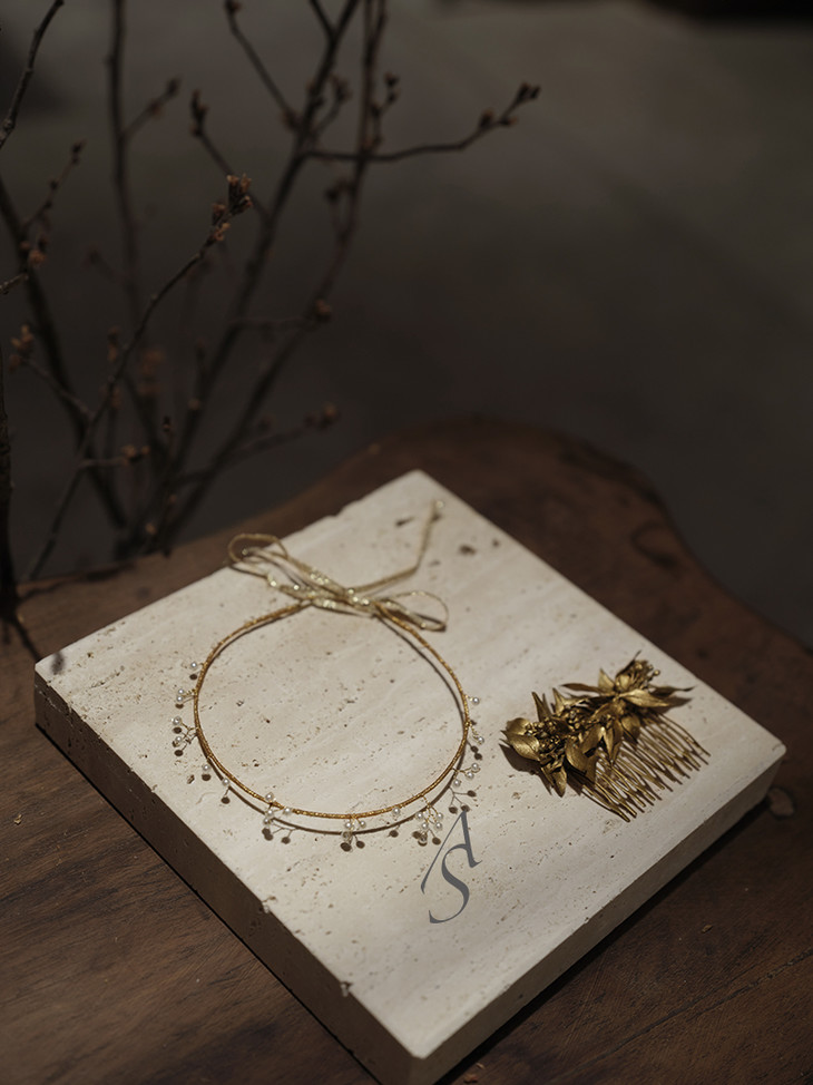 以树木枝叶的形态为灵感,采用施华洛世奇珍珠和金/银丝线,由为Valentino,Christian Lacroix,Schiaparelli高定系列制作发饰的法国高定屋的匠人制作,Cecile Boccara的手工过程成为每件作品的标识。丝带可取下,可做choker项链或头箍佩戴。