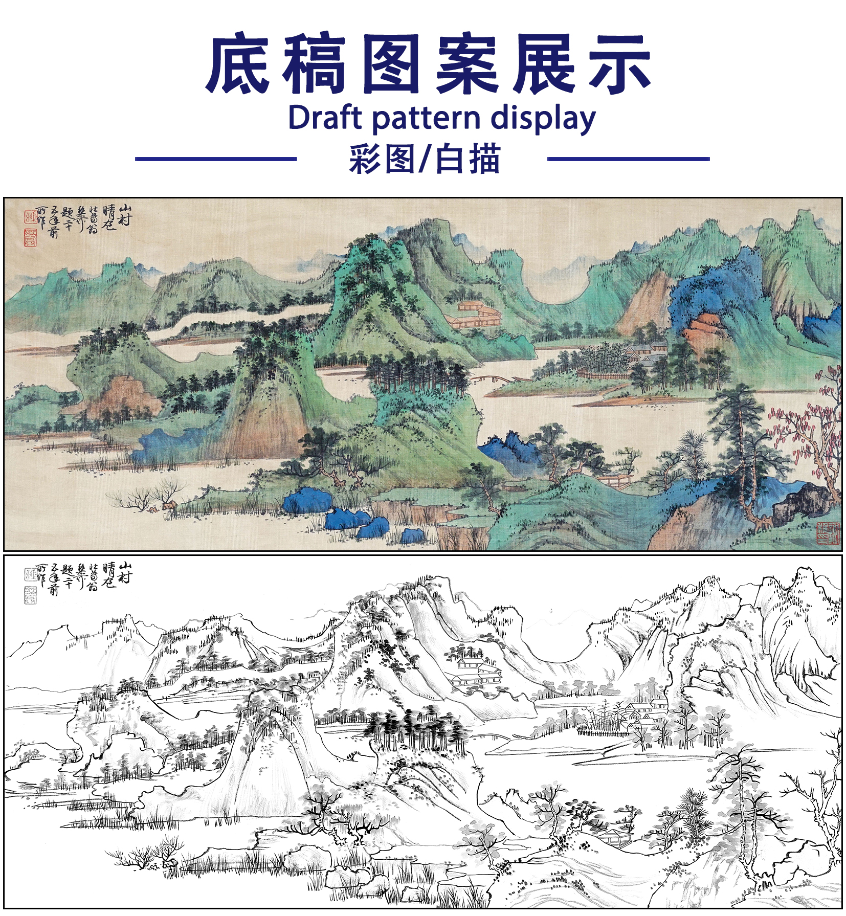 谢稚柳山水工笔画白描底稿《山村晴色》临摹勾线高清打印稿XZ45