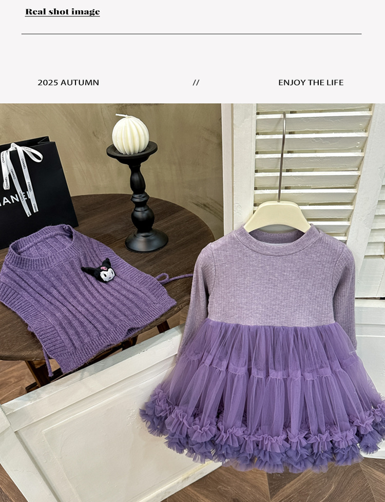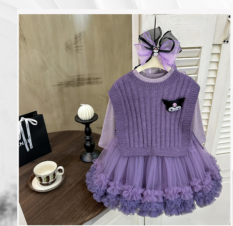 【甜美针织马甲,网纱蓬蓬裙!】可爱库洛米女童两件套套装 2025秋季新款 韩版女宝宝甜美 针织马甲长袖网纱蓬蓬裙两件套秋装-QA