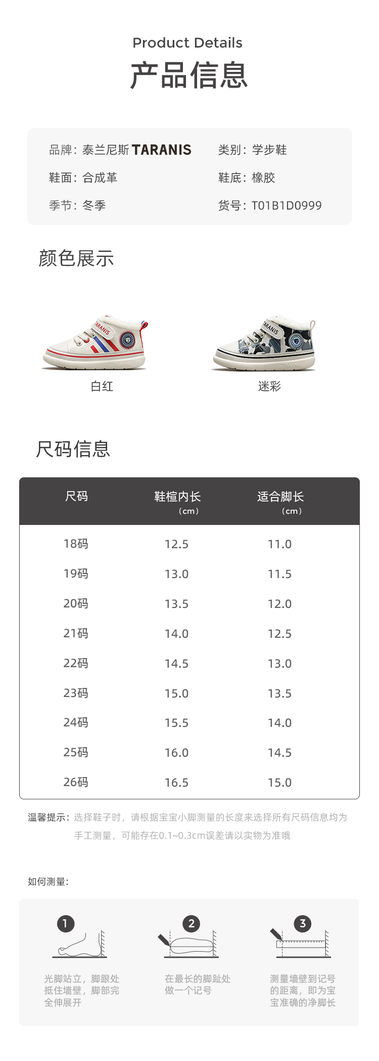 【泰兰尼斯】婴童段冬款加绒保暖经典211系列学步鞋T01B1D0999