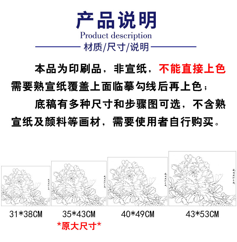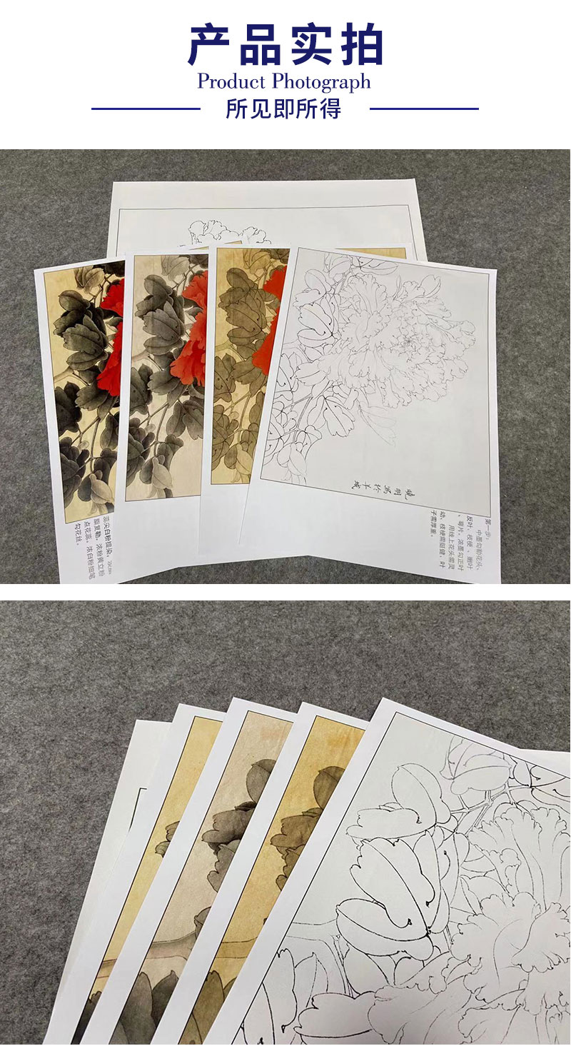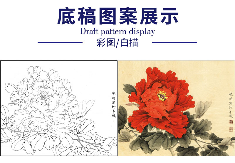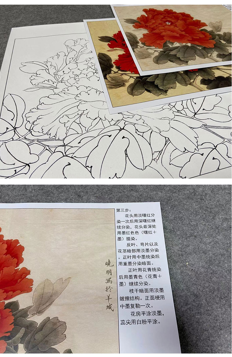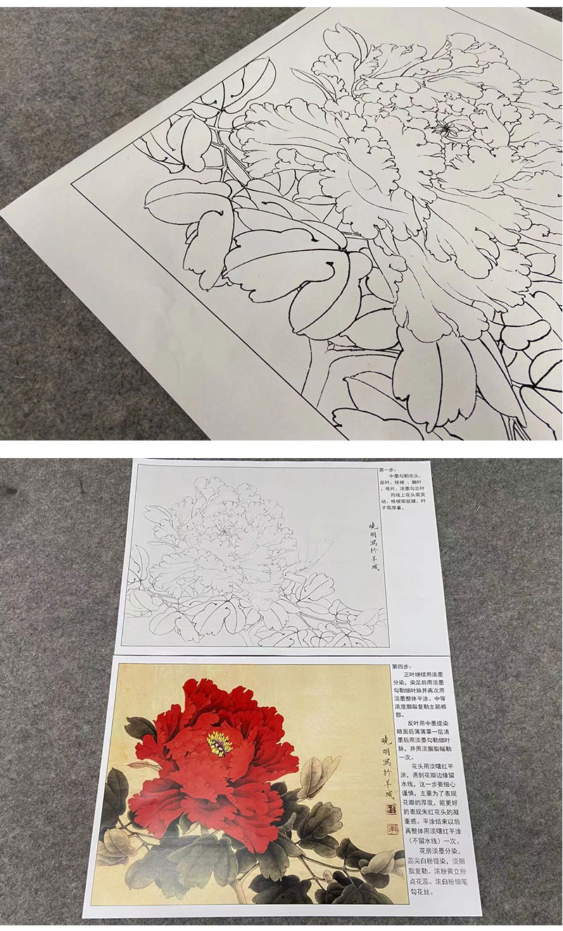 【有步骤、大彩图】李晓明工笔画白描底稿斗方小品《状元红》牡丹初学者临摹花鸟线稿KD45