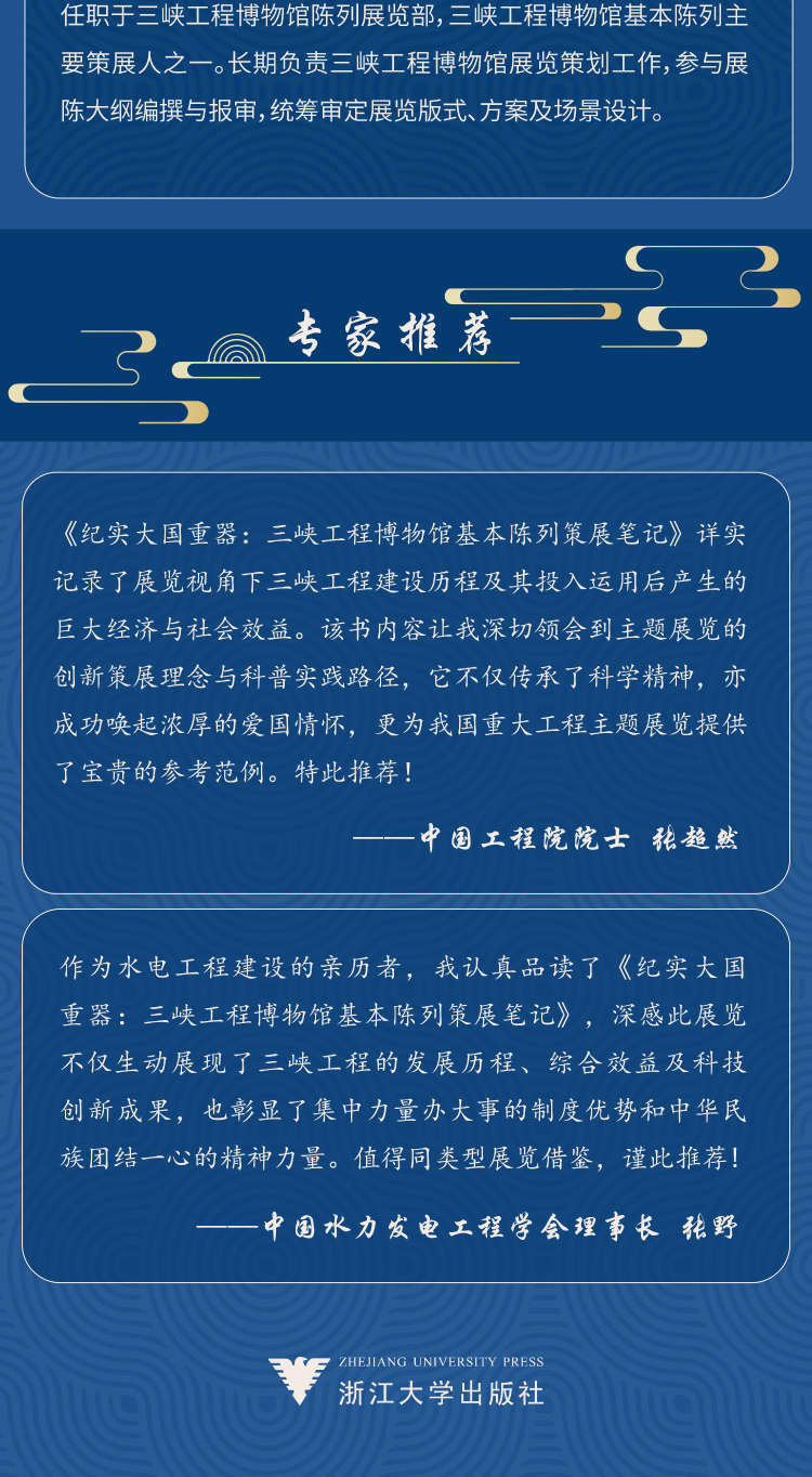 作为水电工程建设的亲历者,我认真品读了《纪实大国重器:三峡工程博物馆基本陈列策展笔记》,深感此展览不仅生动展现了三峡工程的发展历程、综合效益及科技创新成果,也彰显了集中力量办大事的制度优势和中华民族团结一心的精神力量。值得同类型展览借鉴,谨此推荐!