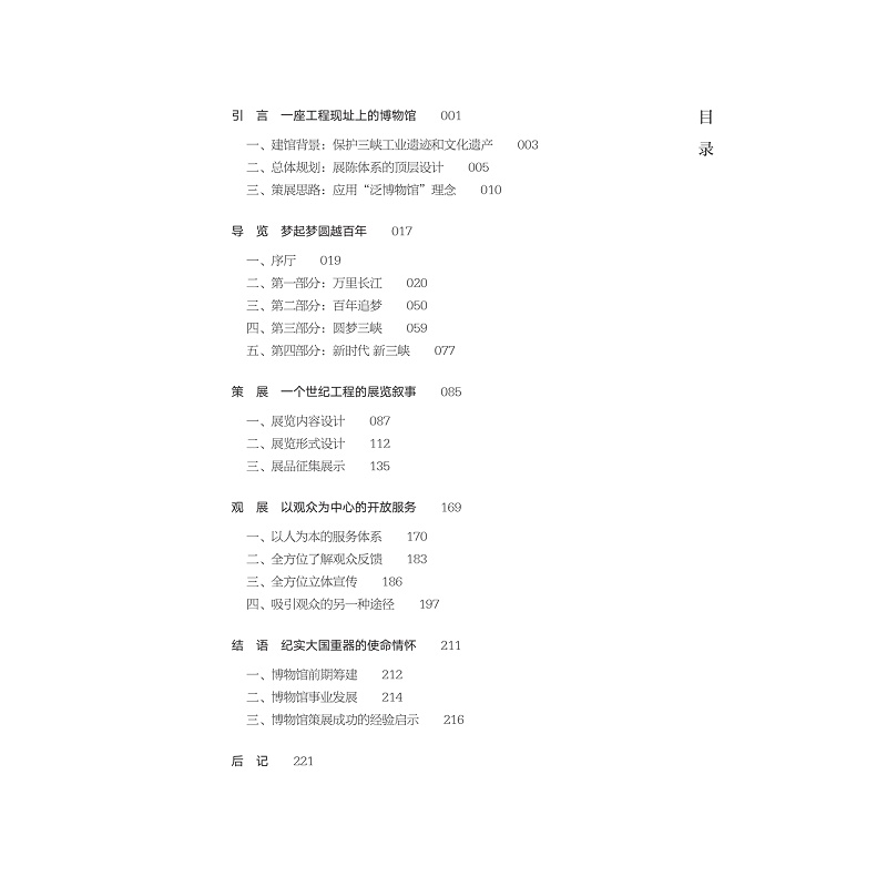 三峡工程博物馆基本陈列以“纪实大国重器”为主题,以“一个标志、三个典范”为主线,展示了三峡工程的百年历史、建设成就和综合效益。本书以总结三峡工程博物馆基本陈列策展实践经验为核心目标,旨在为今后博物馆展览工作提供理论指导与实践启示,并为我国同类型展览的策划与实施提供参考依据。全书分为五章,第一章介绍了建馆背景、总体规划和策展思路;第二章介绍了基本陈列主要内容和结构框架,解读了展览的空间布局逻辑与展示内容脉络;第三章从内容设计、形式设计、展品征集与展示等方面总结了策展实践经验;第四章总结了以观众为中心的策展理念在实践中的运用;第五章回顾了博物馆筹建过程和事业发展历程,全面总结本次策展工作的成效与不足。