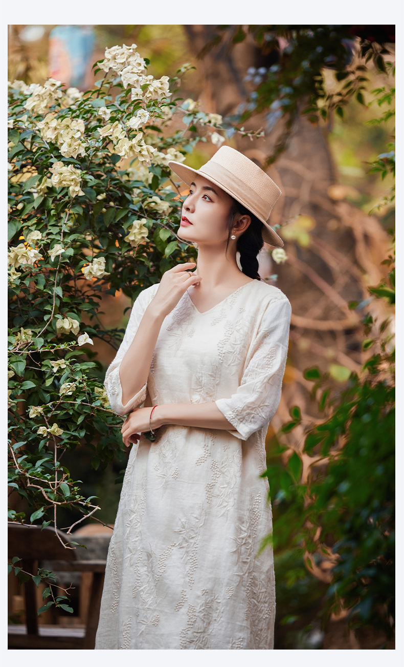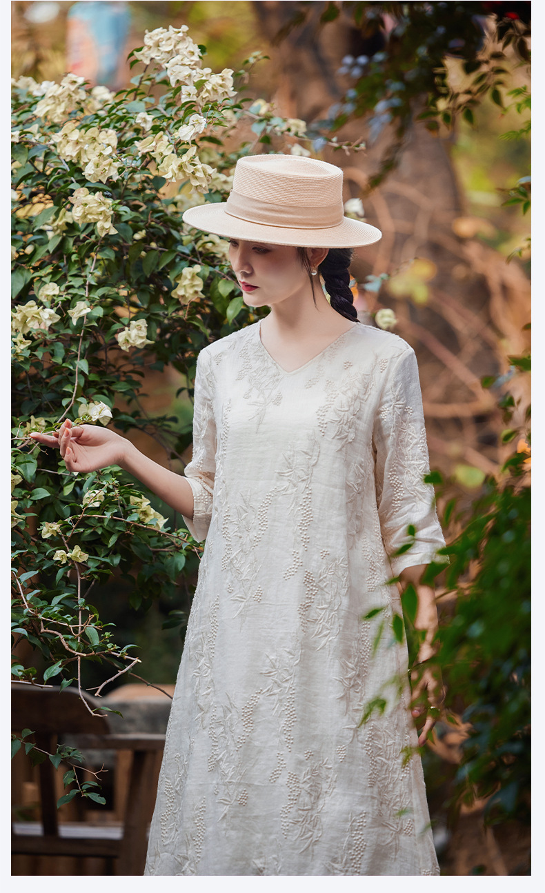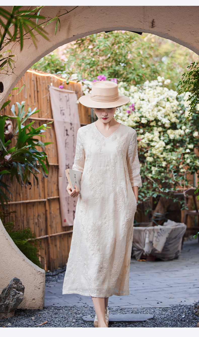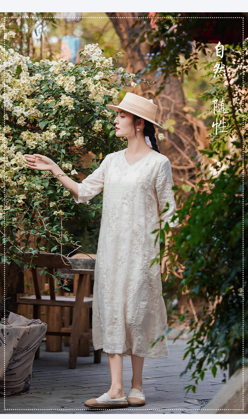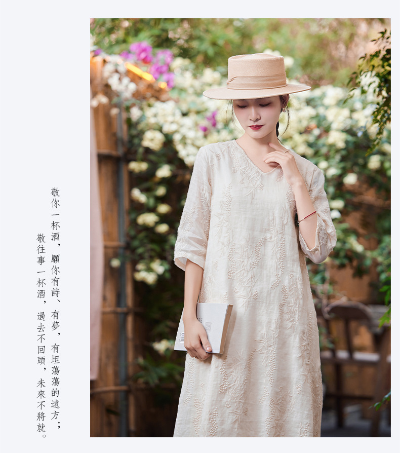 HM-S505春夏新款中式简约苎麻重工刺绣V领文艺七分袖淑女仙气A字连衣裙