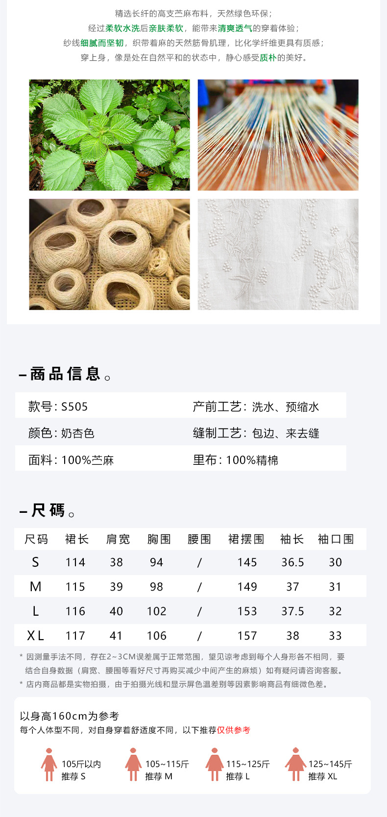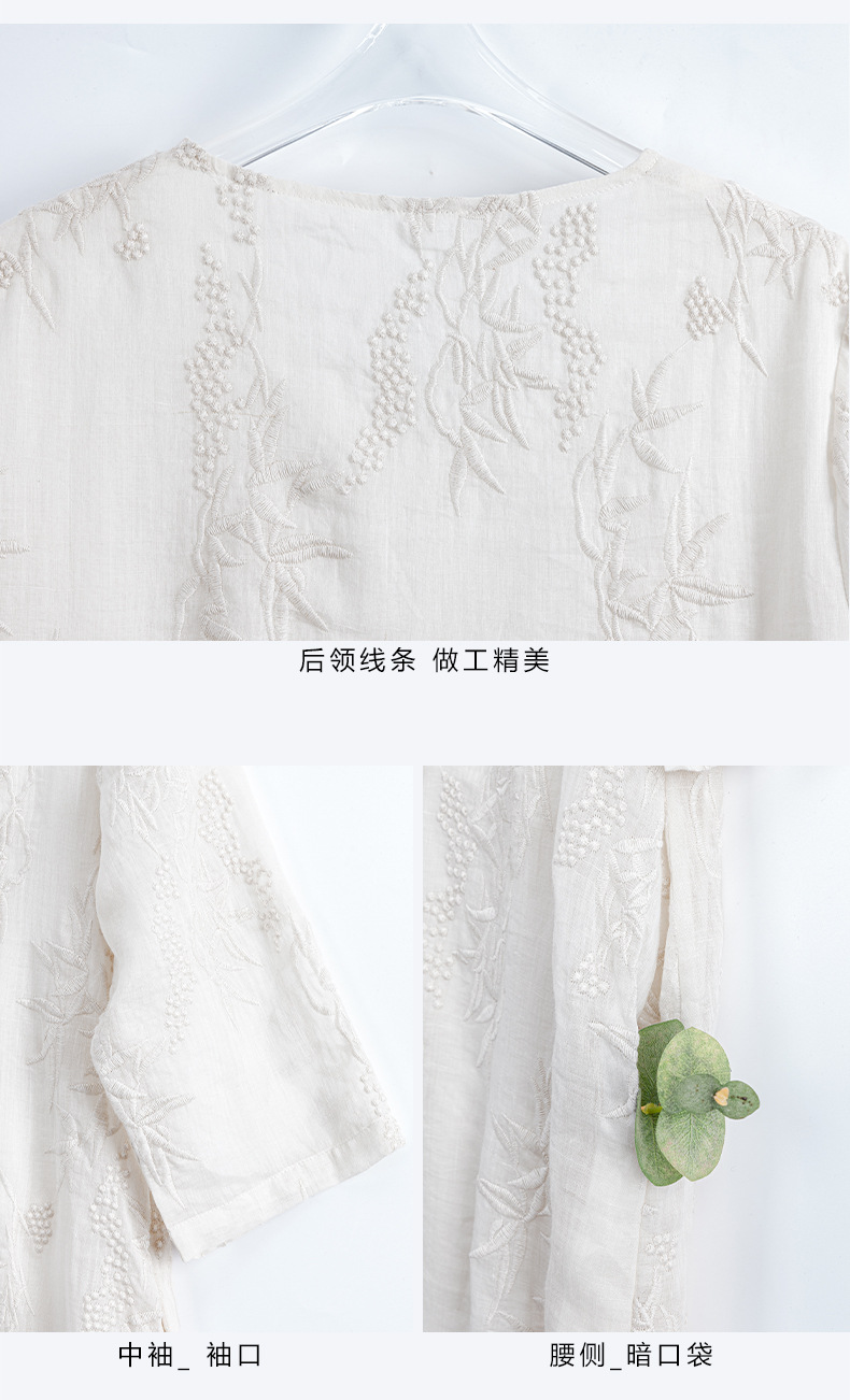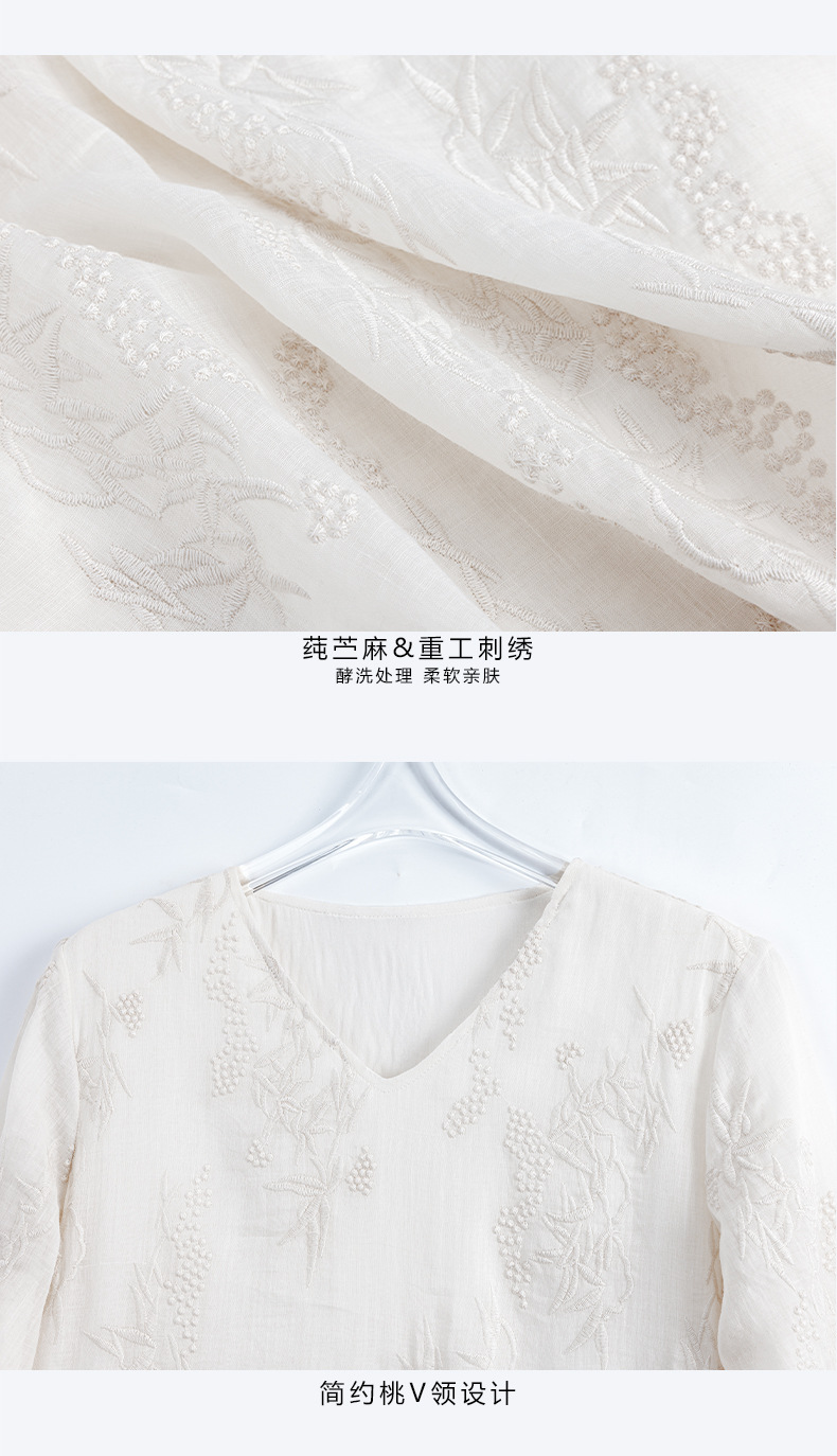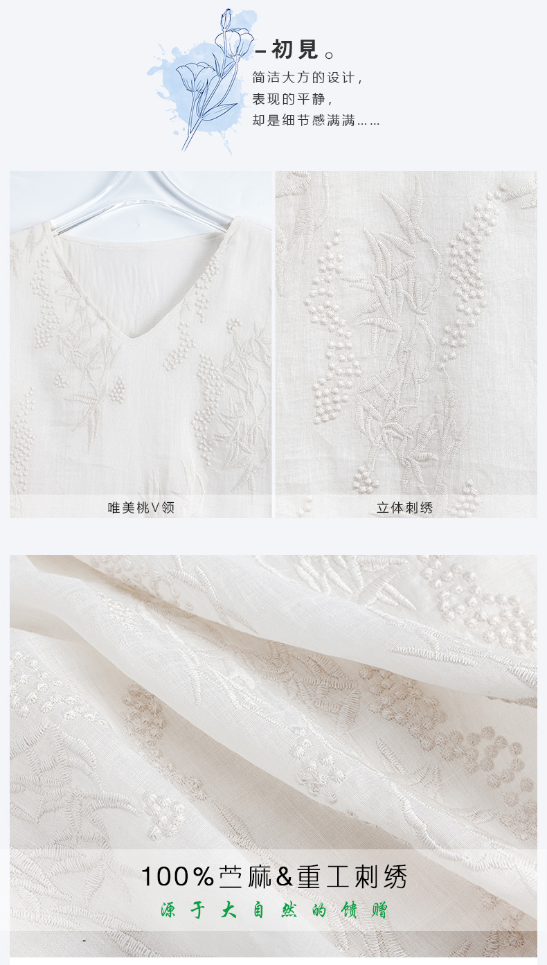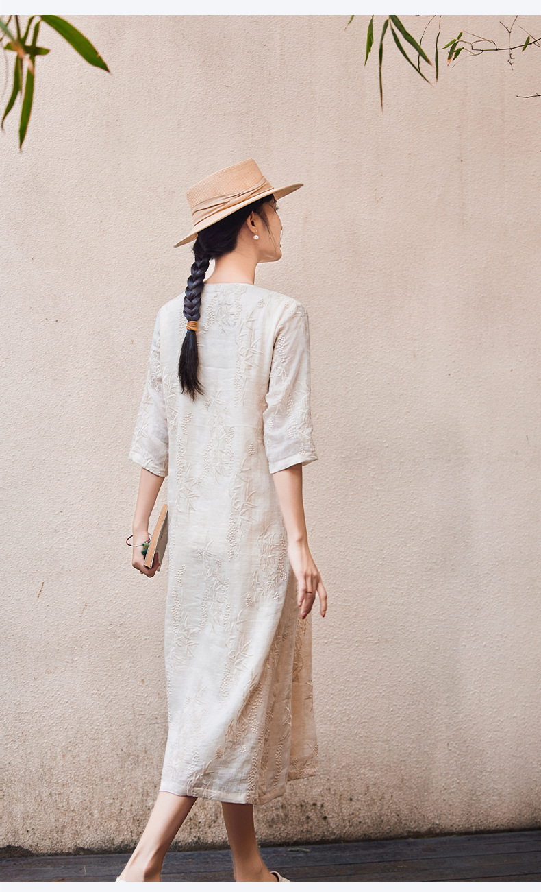 HM-S505春夏新款中式简约苎麻重工刺绣V领文艺七分袖淑女仙气A字连衣裙