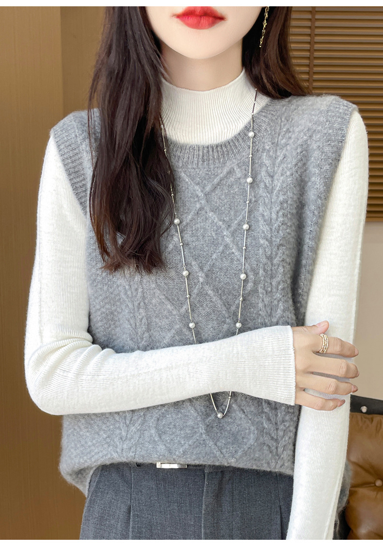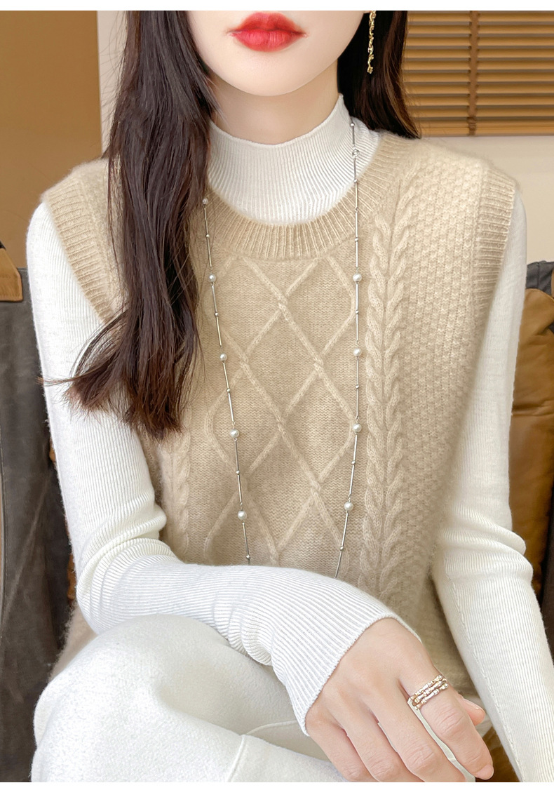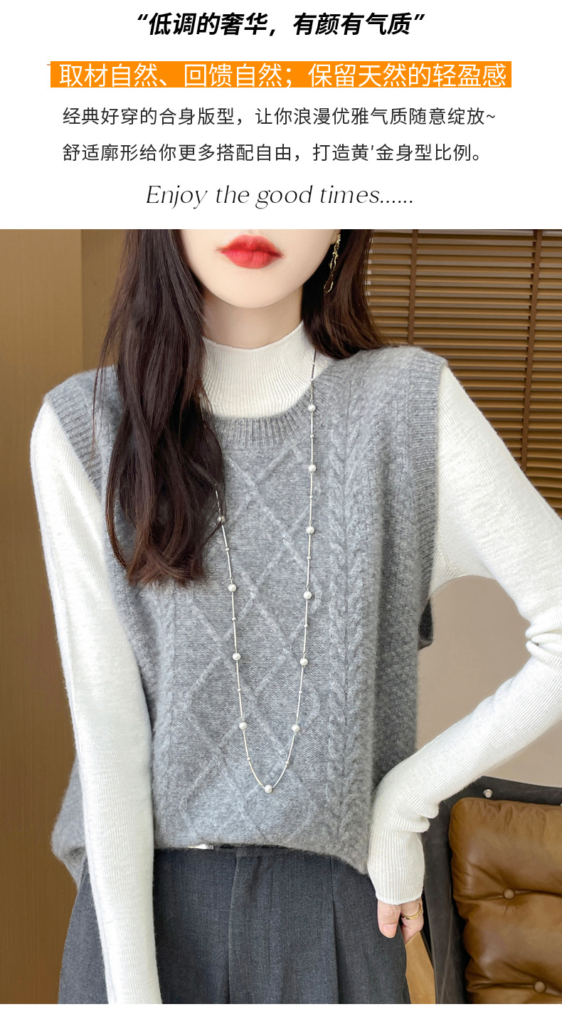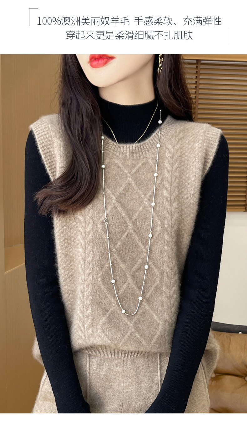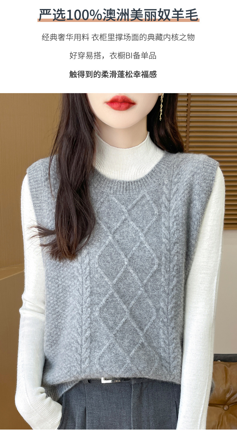 丁摩100%羊毛新款女装圆领短款菱形绞花套头无袖马甲针织背心ALM2-176