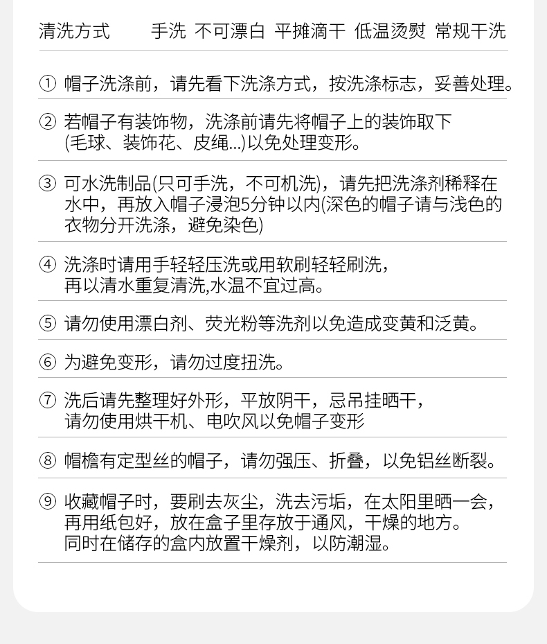 【其他注意事项】注意帽子的洗涤方式,每顶帽子都有吊牌
