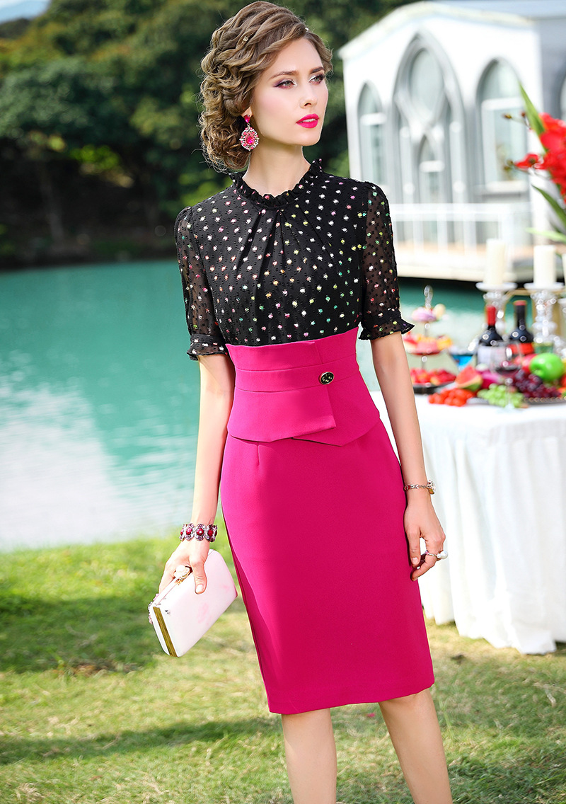 FMY-31098新款时尚优雅气质修身拼接印花假两件连衣裙