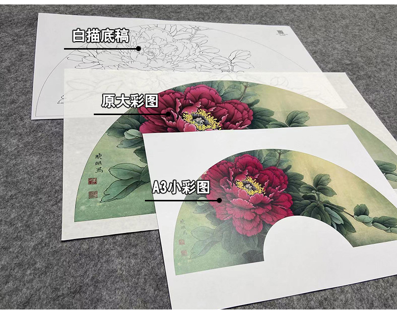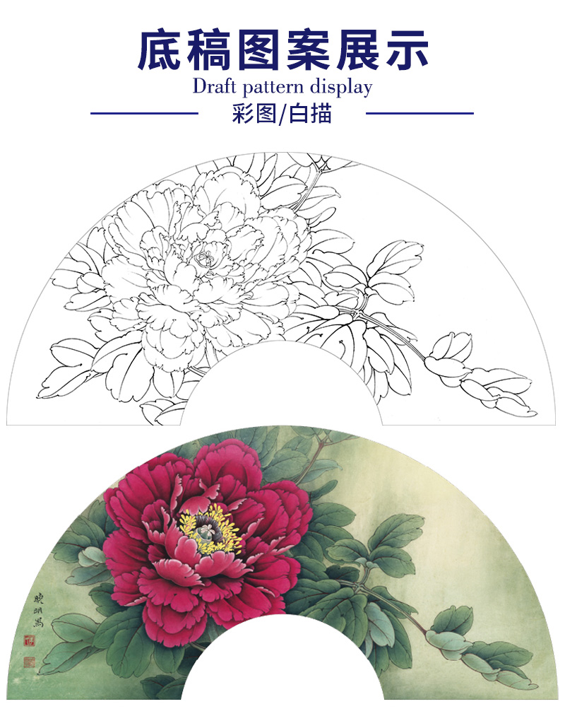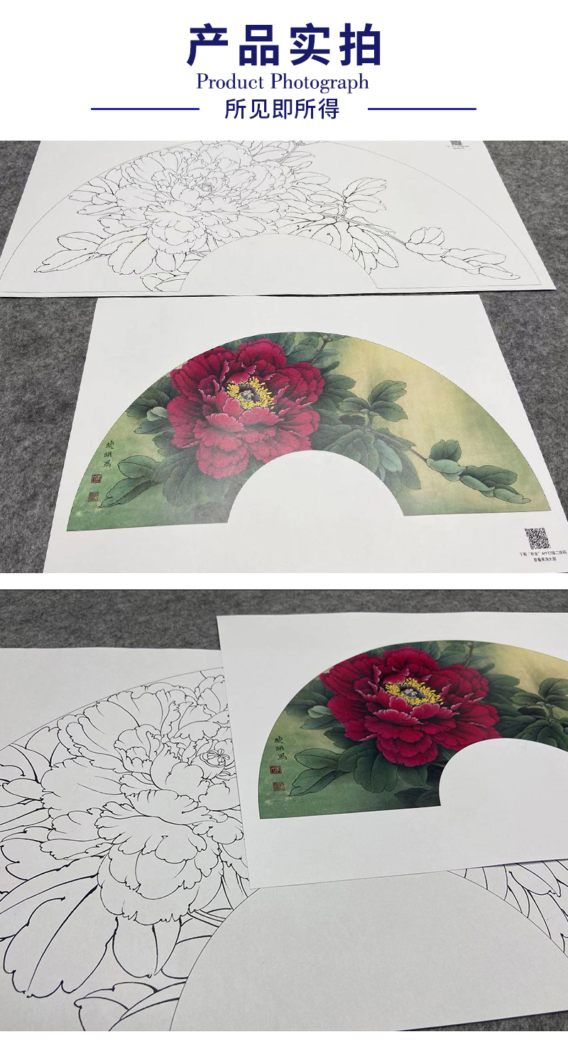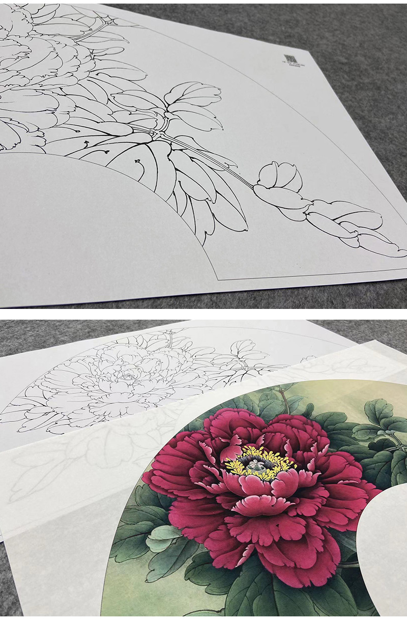 【大彩图】李晓明工笔画白描底稿扇面小品《胡红》牡丹临摹勾线花鸟线稿K004