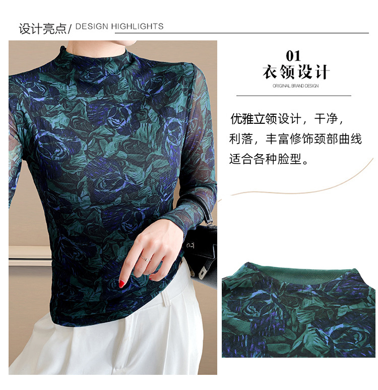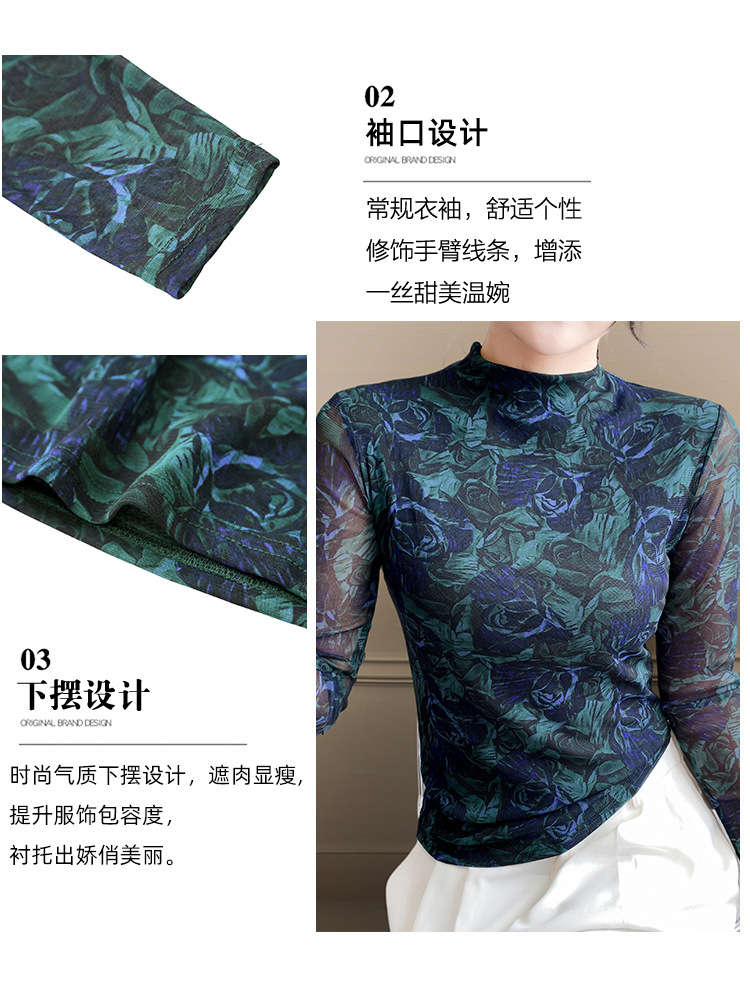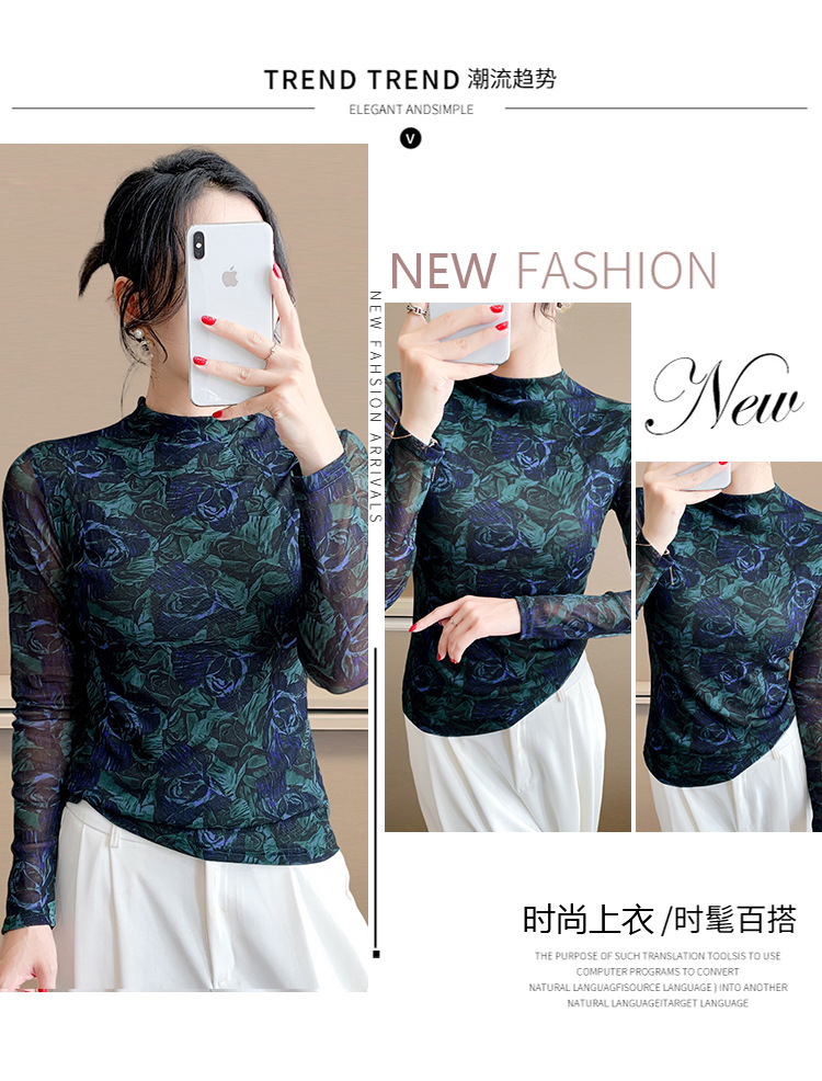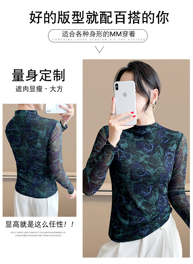 KQL A55F8700时尚纱网印花长袖半高领修身显瘦洋气T恤上衣