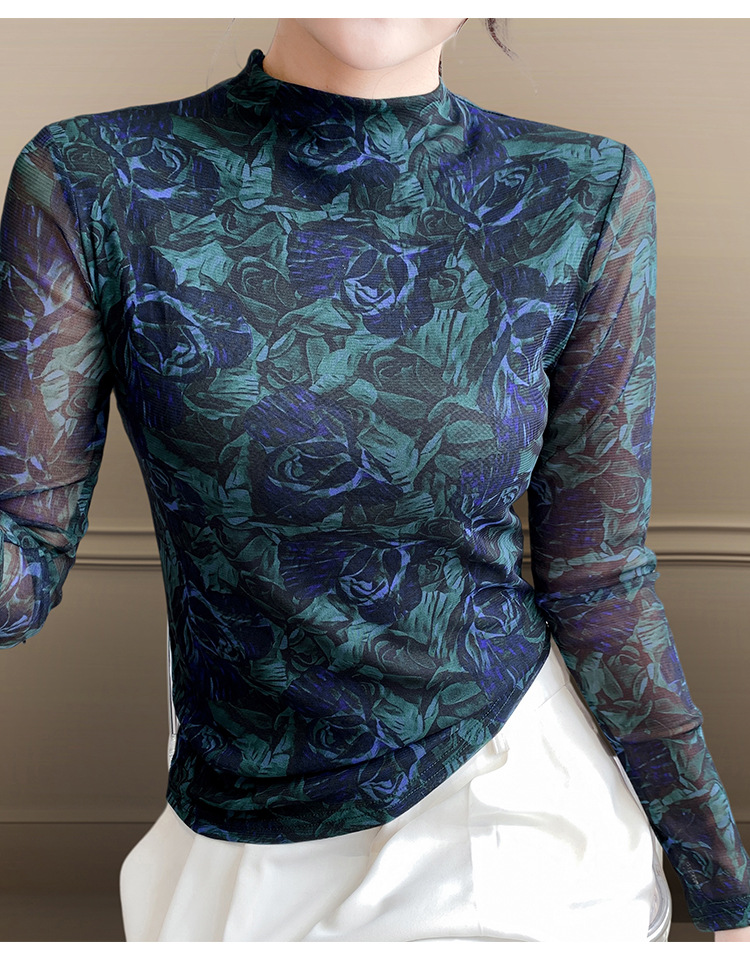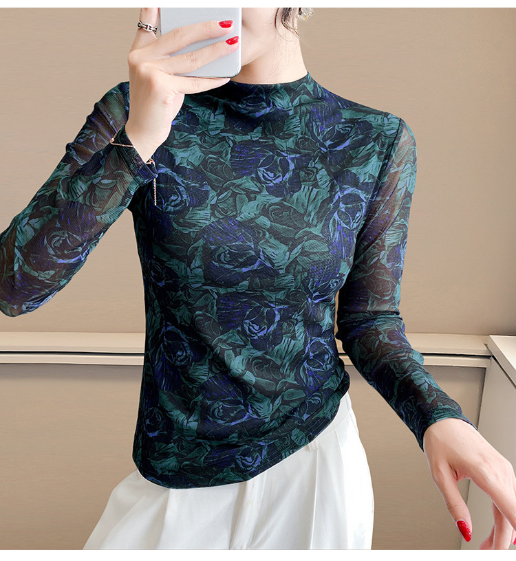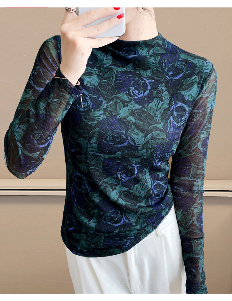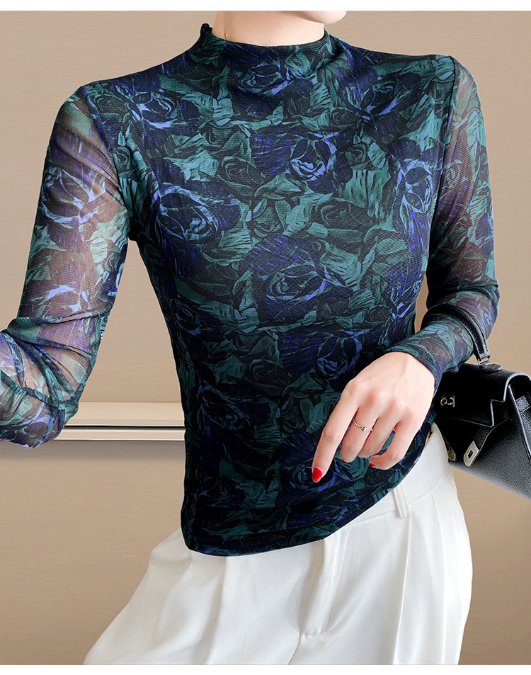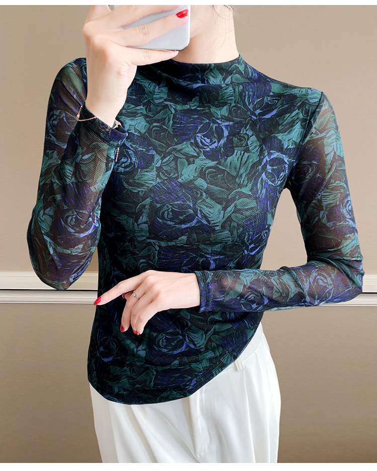 KQL A55F8700时尚纱网印花长袖半高领修身显瘦洋气T恤上衣