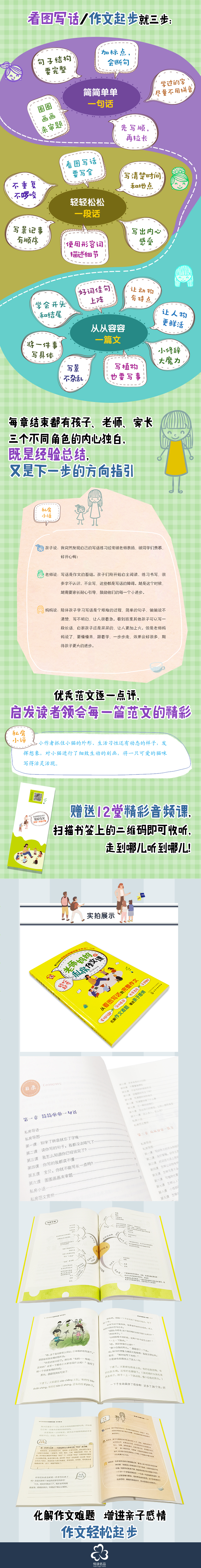 2.本书以日记体的形式,记录了孩子从看图写话开始,到洋洋洒洒写就一篇漂亮作文的过程中,遇到的各种问题,分析原因,给出思路,支出绝招,让孩子由不会写到会写、由写不好到写得好,收获高分,建立自信。