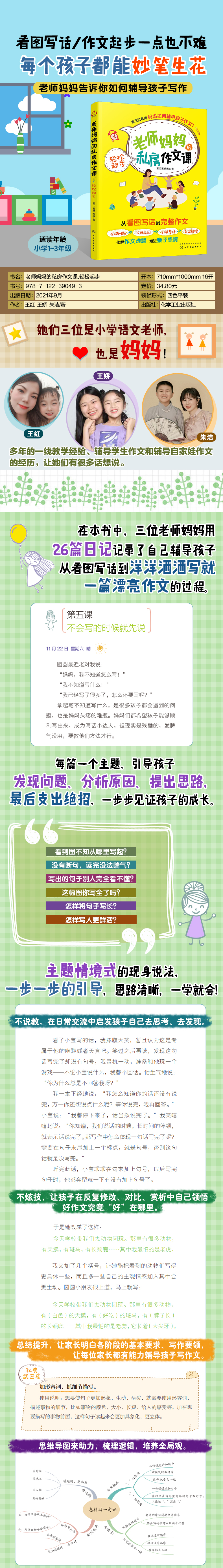 本书是三位老师妈妈联手分享的多年陪伴孩子写作文的经验,以26篇日记的形式,记录了孩子从看图写话,到洋洋洒洒写就一篇漂亮作文的过程中,遇到的各种问题,分析原因、给出思路、支出绝招,让孩子由不会写到会写、由写不好到写得好,收获高分,建立自信。