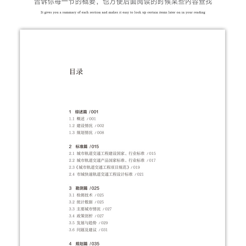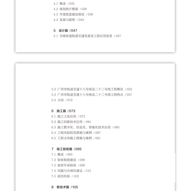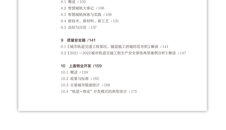 《2022中国城市轨道交通工程建设发展报告》由综述篇、标准篇、规划篇、勘测篇、设计篇、施工篇、竣工验收篇、新技术篇、上盖物业开发篇、质量安全篇等组成。每篇多包括概述、政策标准、最新建设情况,问题与建议、进展与动向等部分或分类型进行专题介绍。 报告立足于城市轨道的建设与发展,从政府、行业、企业角度出发,选用2022年最新数据,客观反映城市轨道交通的政策环境,以及我国城轨交通建设的各个方面情况,并从行业角度阐述我国城轨交通发展中的热点与焦点问题。