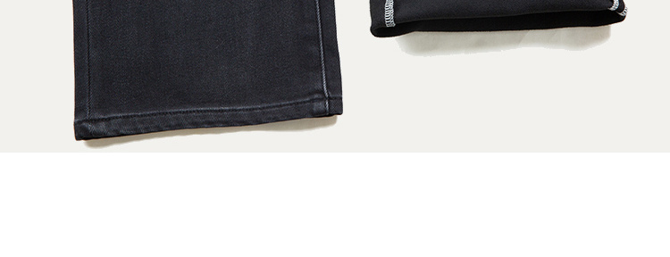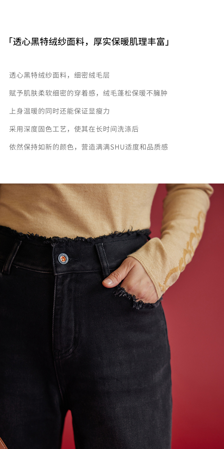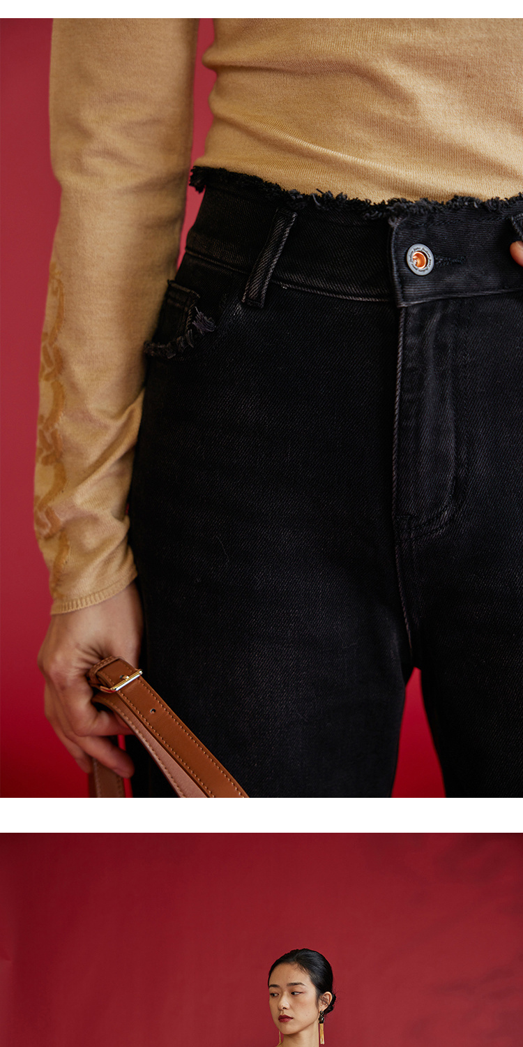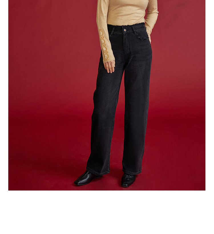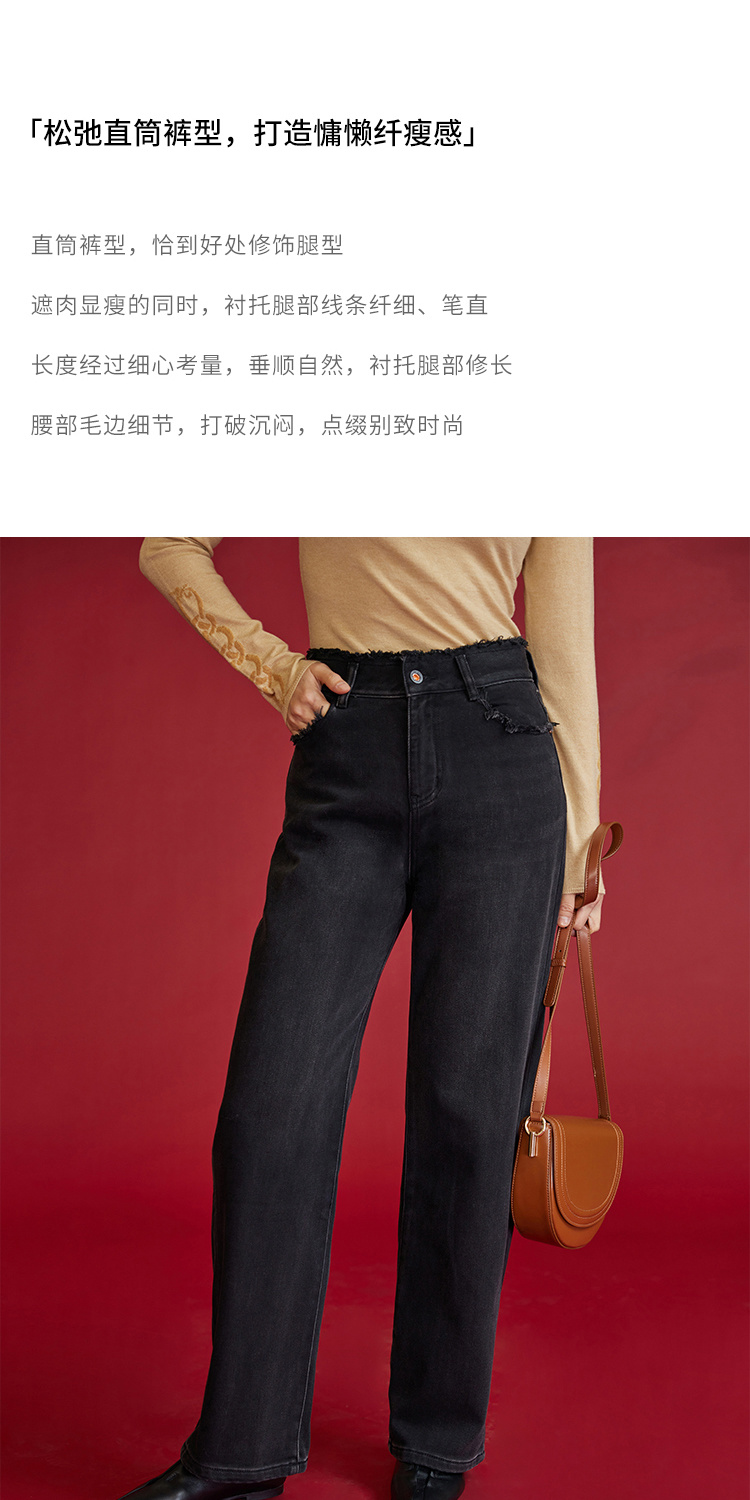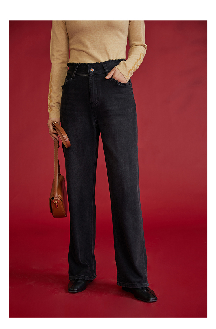 HeyDress加绒牛仔裤女冬季高腰显瘦毛边直筒裤黑色长款休闲裤子