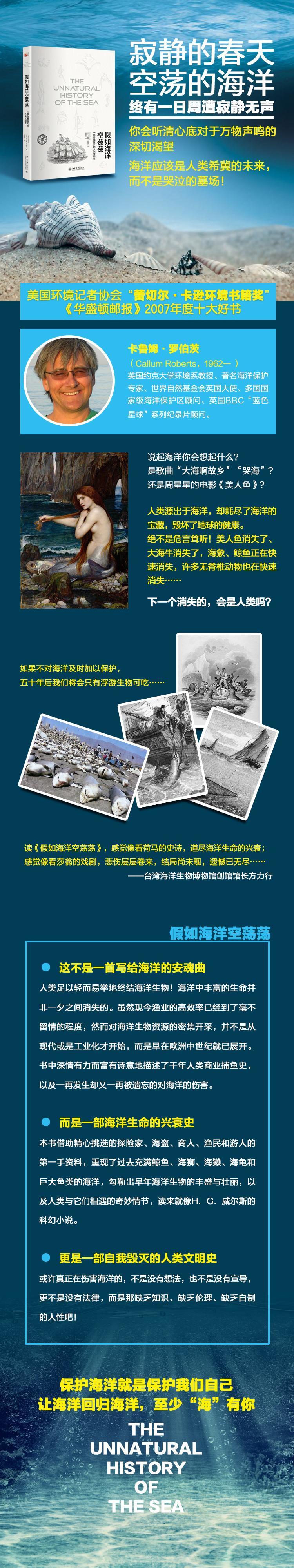 本书借助精心挑选的探险家、海盗、商人、渔民和游人的第一手资料,深情地重现了一再发生却又一再被遗忘的海洋生物历史伤痕,探讨了悠久的商业捕鱼史,展现了在人类贪婪的攫取下,海洋如何从过去的丰盈走向现今的空荡,带领读者穿越五个多世纪的历程,见证了海洋的衰亡。摆在人类面前的出路并非一片黑暗,全书最后一章,在单独划出的海洋保护区,动植物已经恢复到过去一个世纪之前的程度,这样的成果表明,就像“寂静的春天”可以变得不再寂静,空荡的海洋同样可以变得不再空荡。