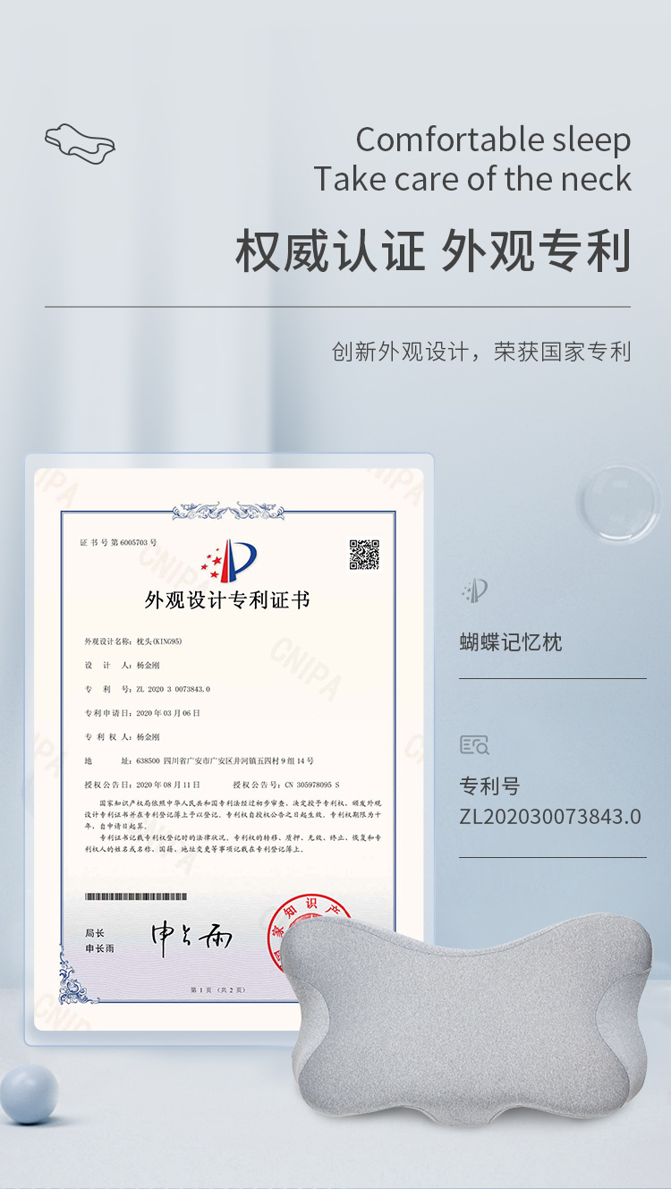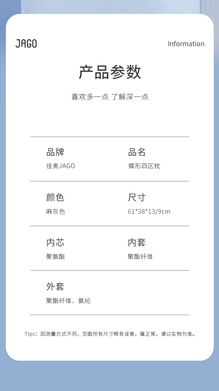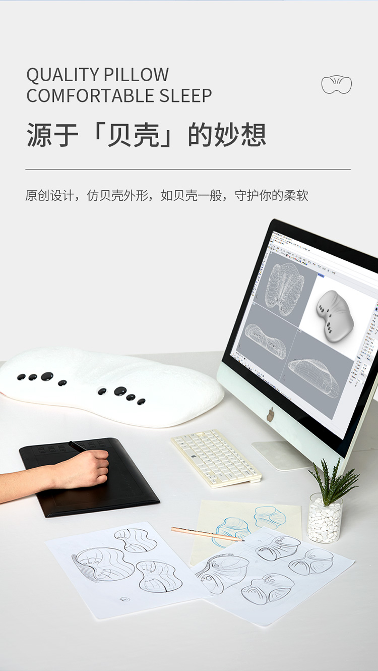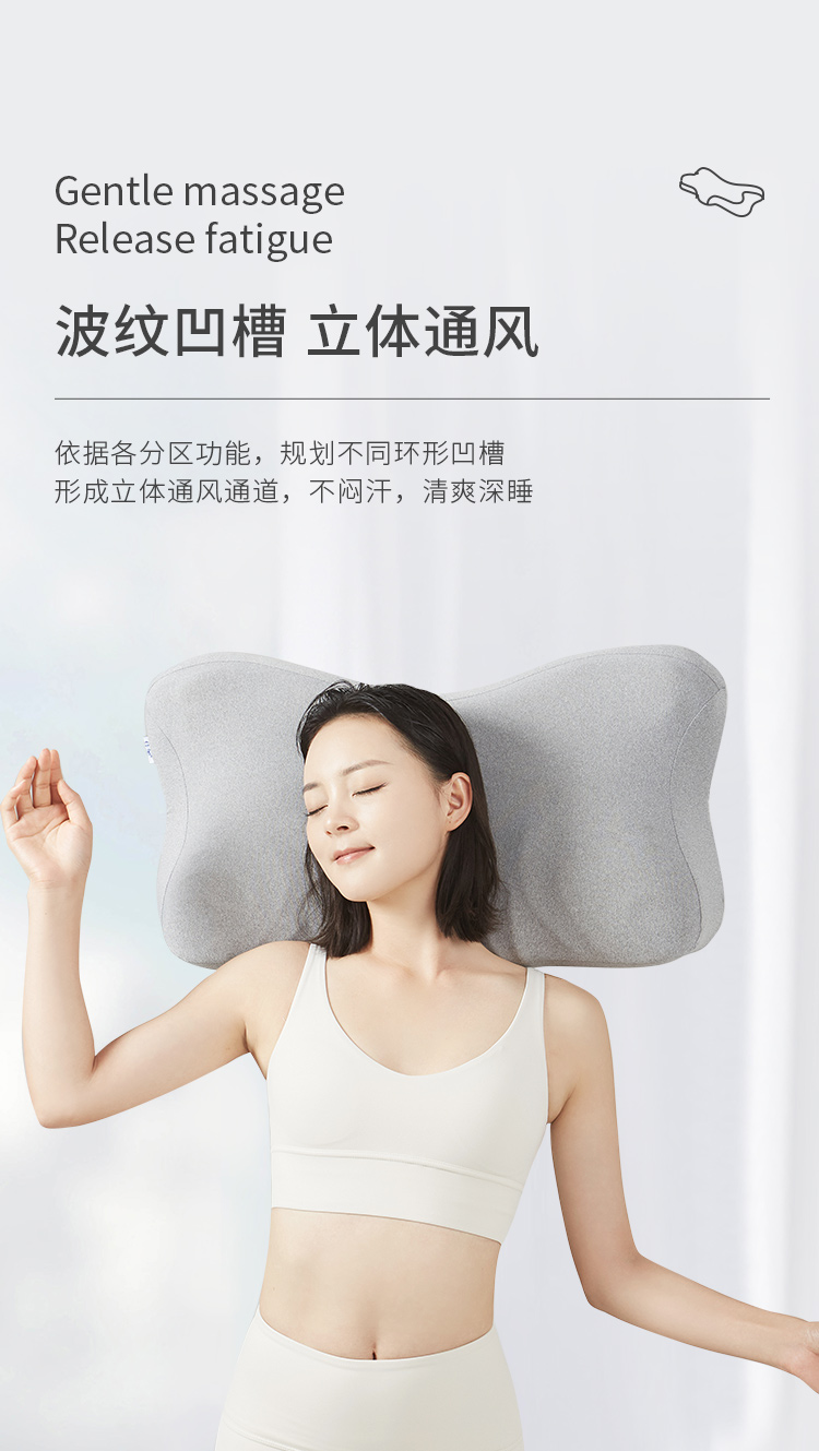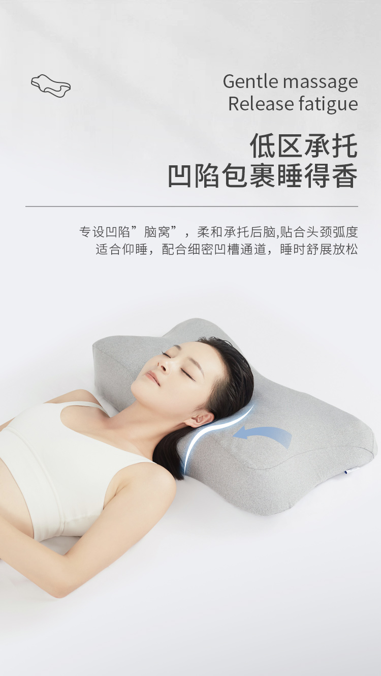 佳奥蝴蝶分区枕 颈部、肩部、头部、手臂各个区域功能明确 蝴蝶形设计 适合不同睡姿; 舒心放手区,睡眠不怕手麻 舒缓肩颈酸痛;贝壳肩颈枕 贝壳肌理,放松紧绷神经 释放全身压力 舒适好眠