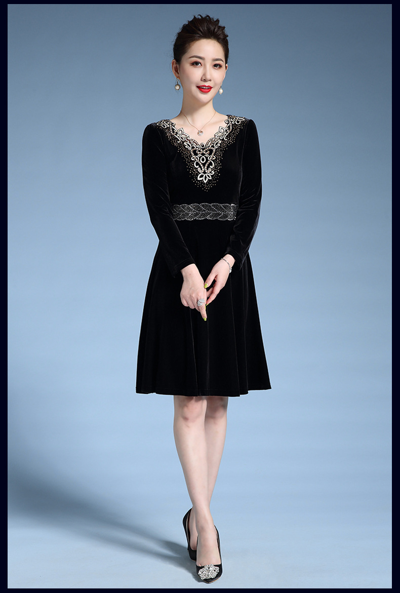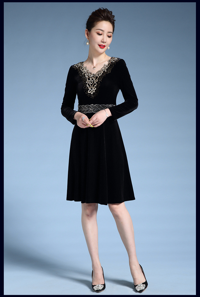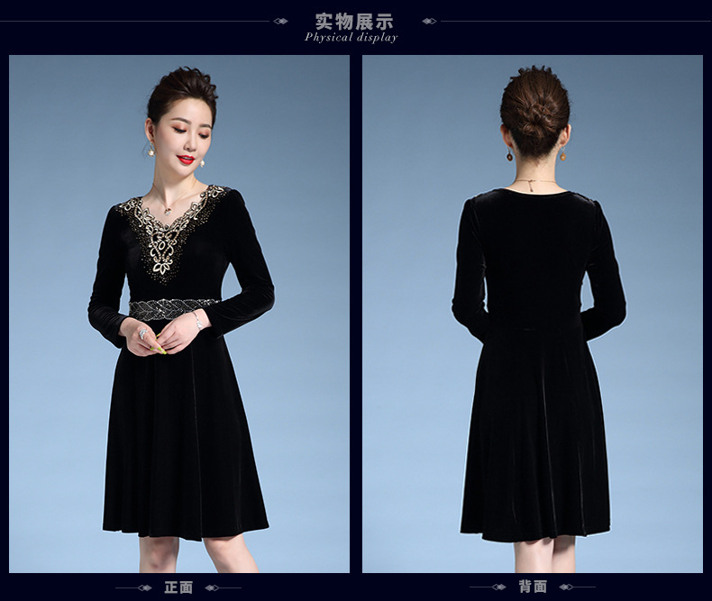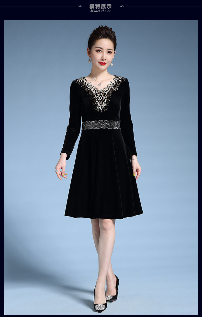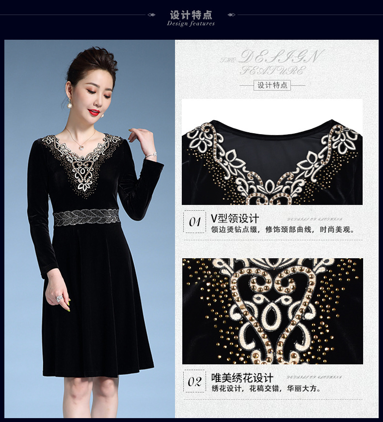 MY-69198丝绒连衣裙大码V领绣花大摆裙