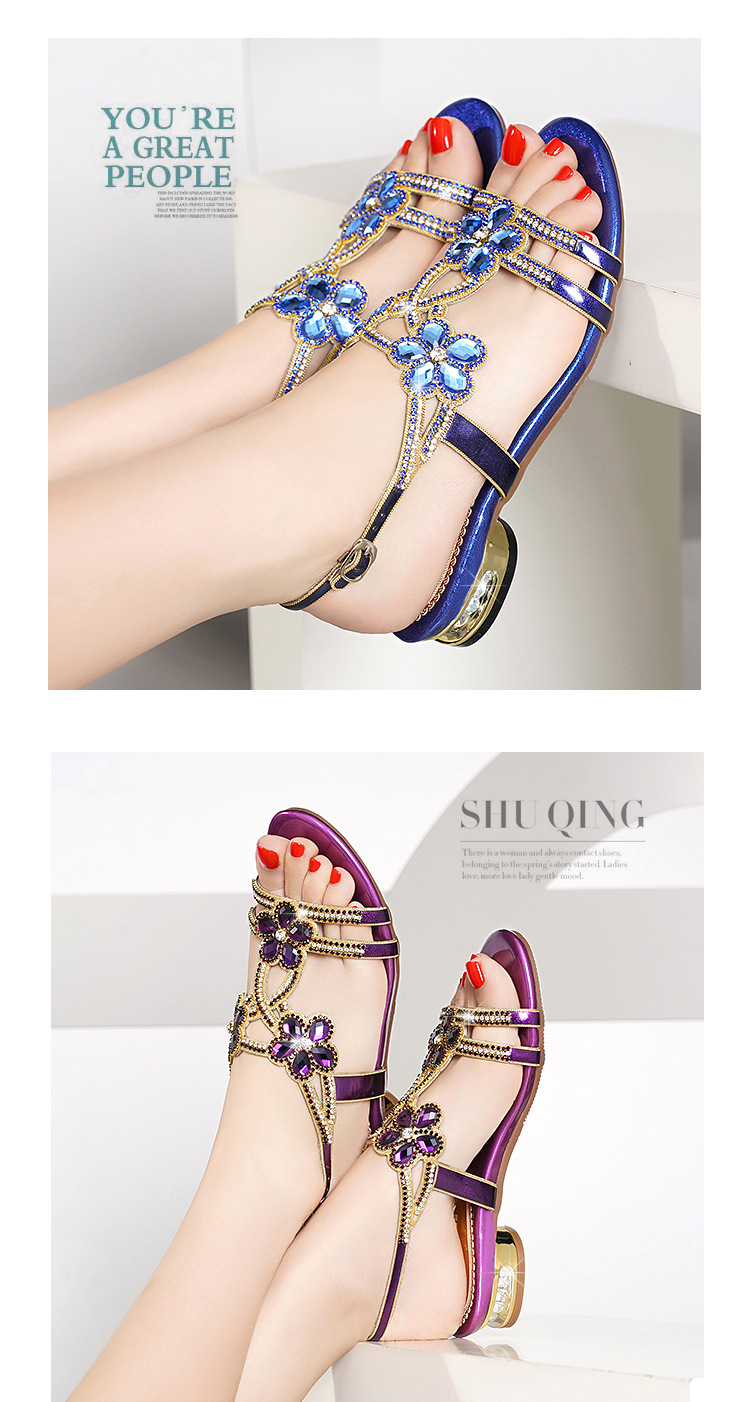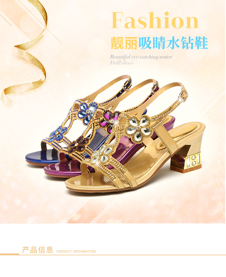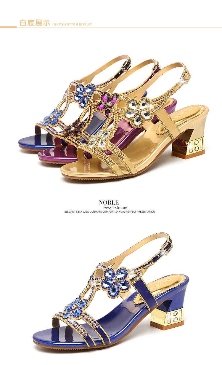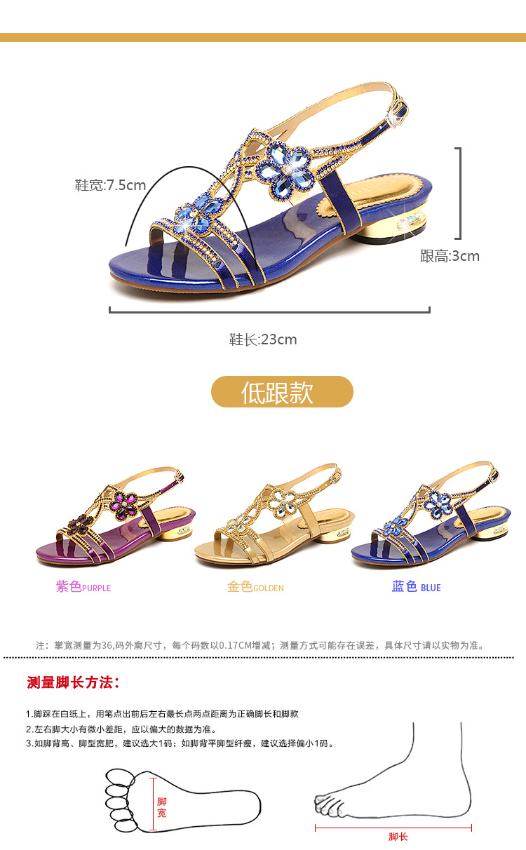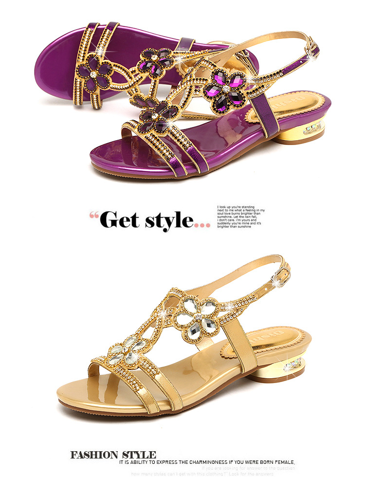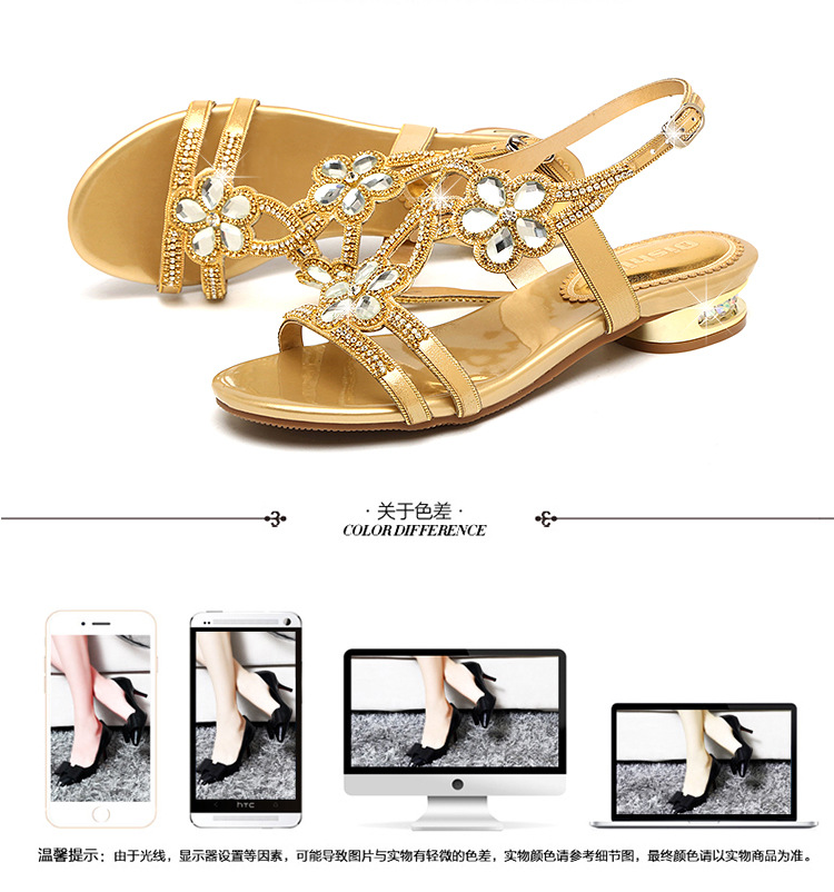 新款水钻平底低跟高跟凉鞋粗跟花朵百搭凉鞋LXa0