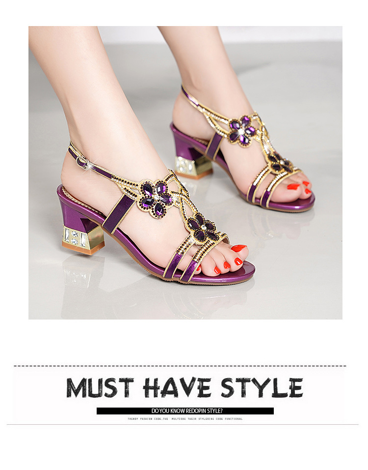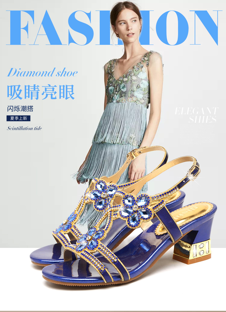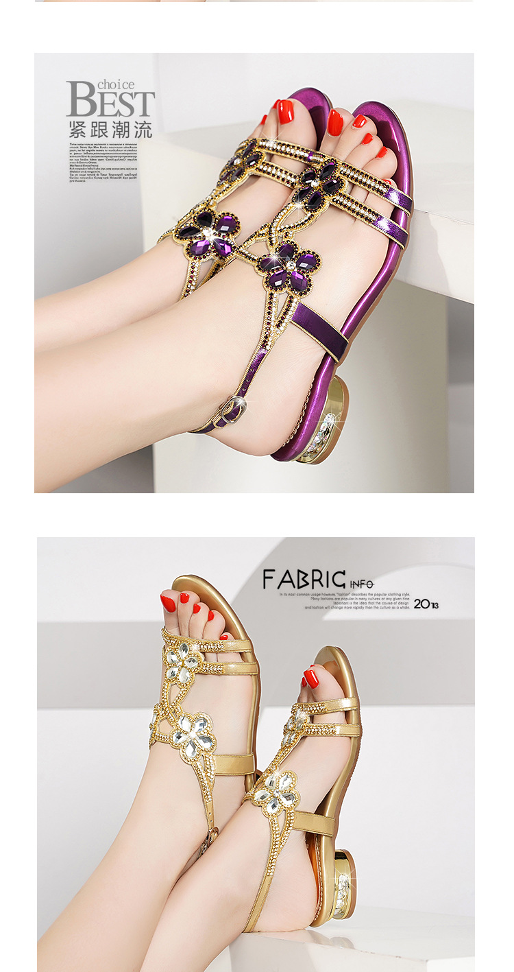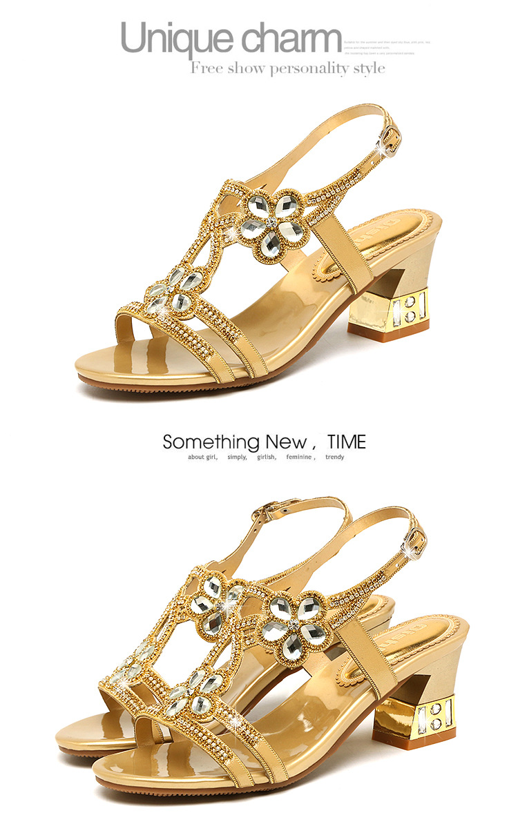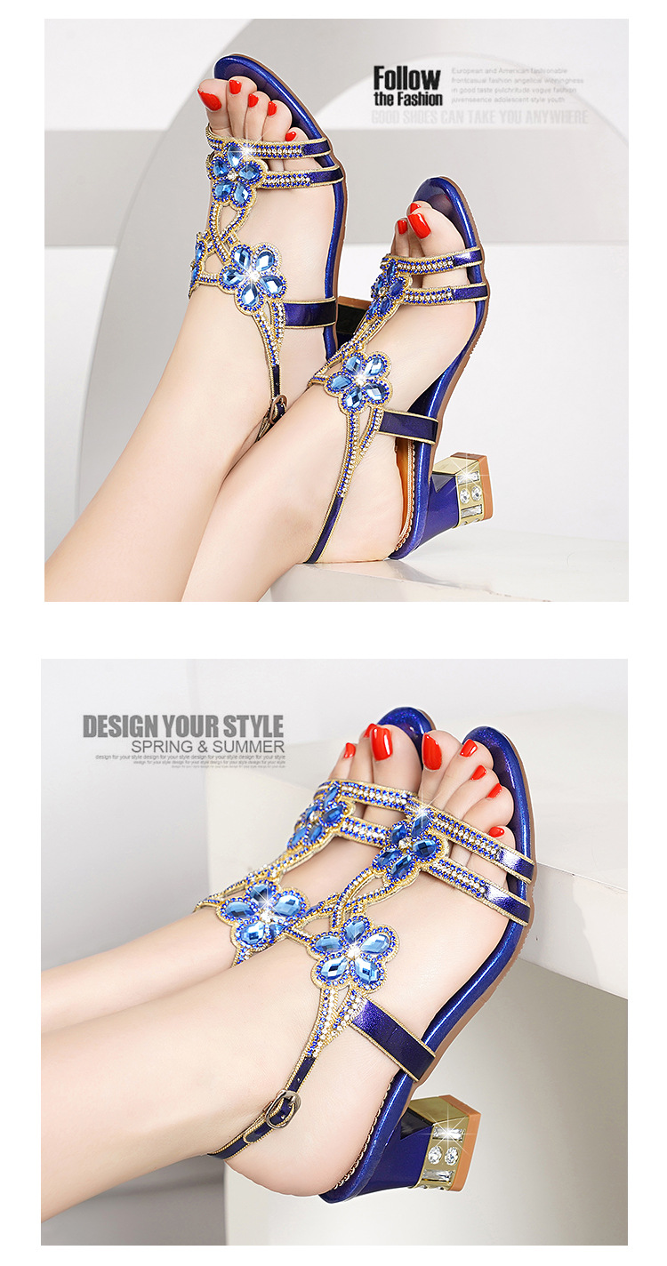 新款水钻平底低跟高跟凉鞋粗跟花朵百搭凉鞋LXa0
