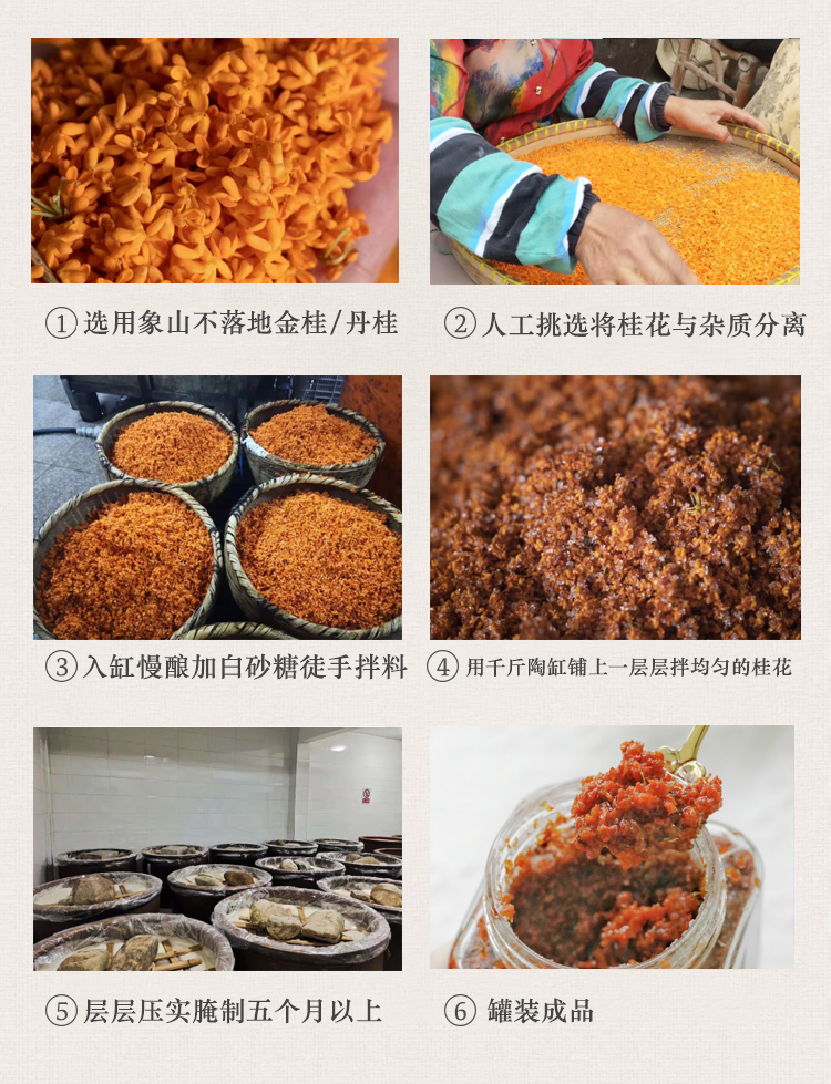 2、只选用象山不落地金桂/丹桂,清晨带露水采摘,用料考究;