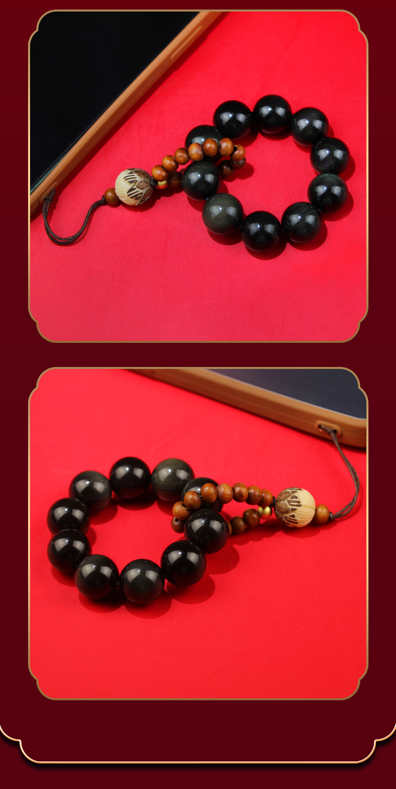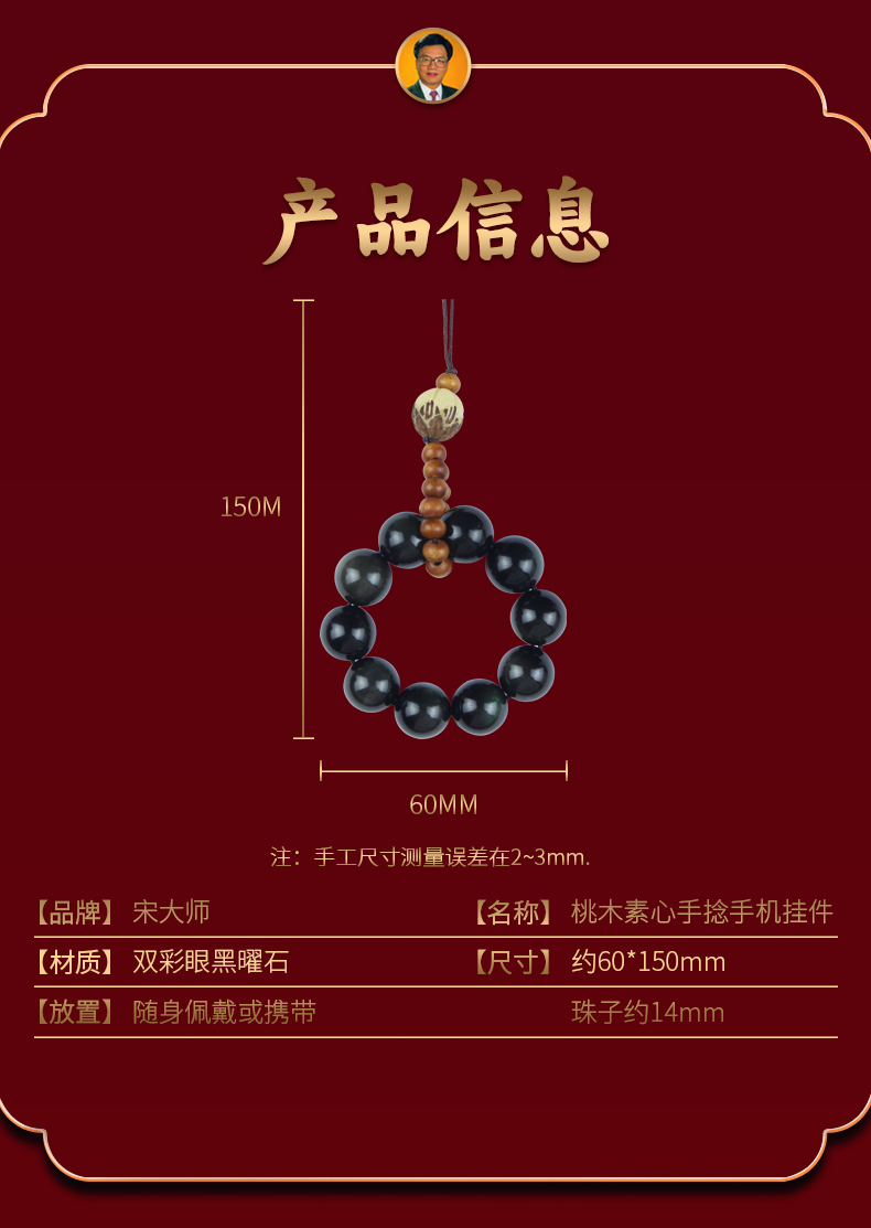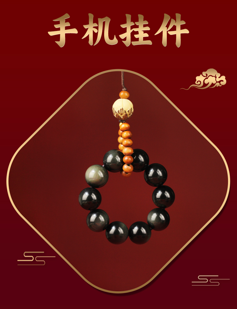 宋大师桃木素心小手捻绕指柔双彩眼黑曜石手机挂件包挂饰物