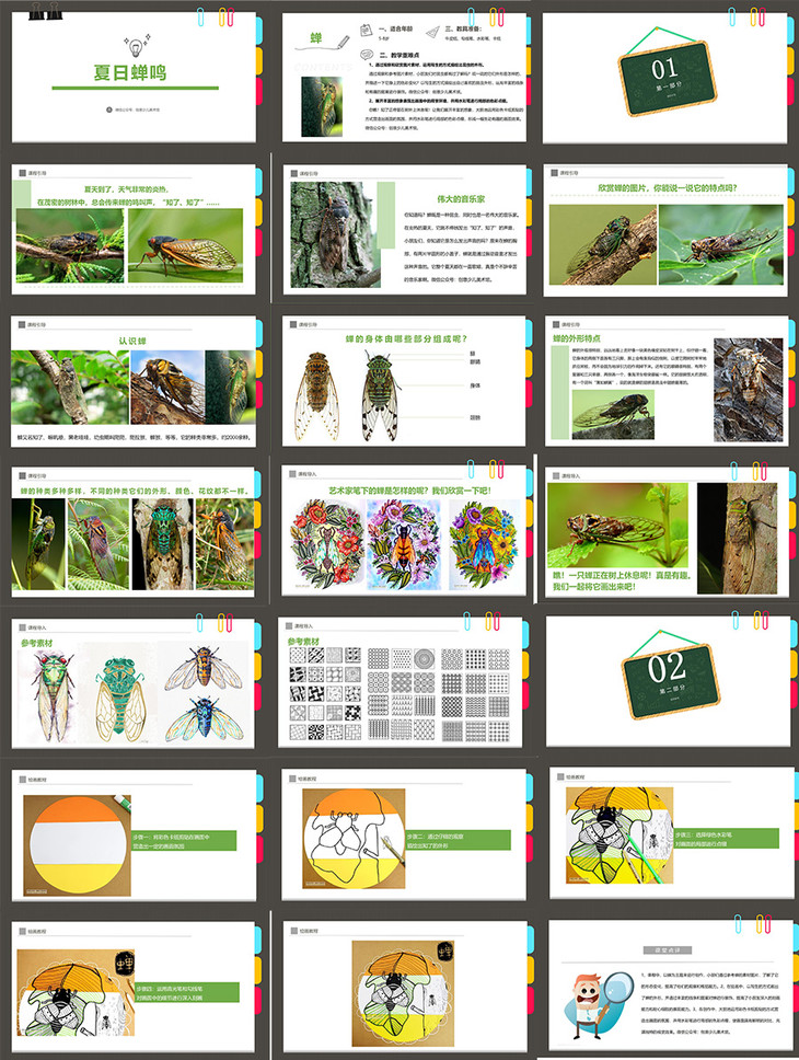 你瞧!知了正停留在树叶上休息呢!让我们展开丰富的想象,大胆地运用彩色卡纸剪贴的方式营造出画面的氛围,并用水彩笔进行局部的色彩点缀,形成一幅生动有趣的画面效果。