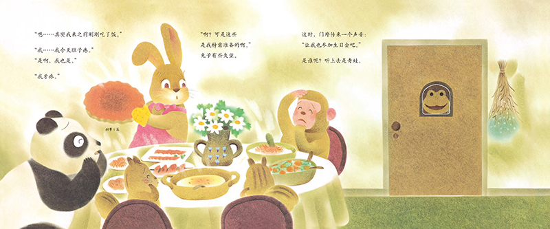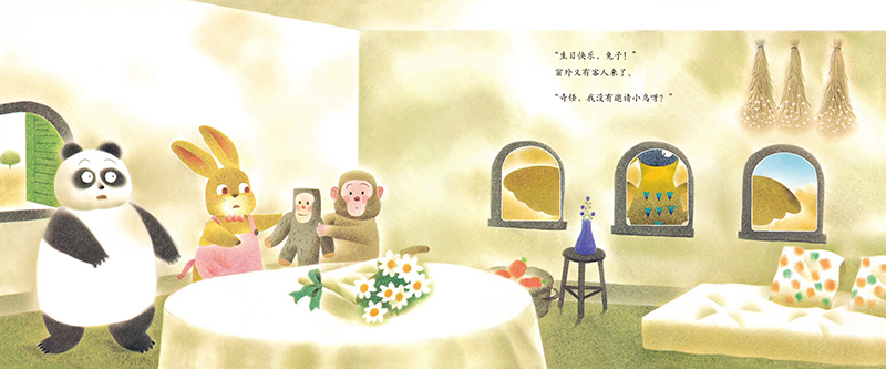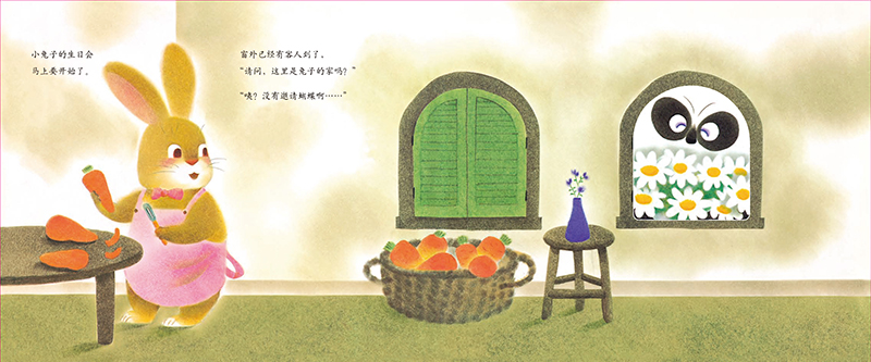 窗外已经有客人来了!“咦?我没邀请蝴蝶啊!”兔子有点儿疑惑。打开窗一看,“哎呀,原来是熊猫啊!”窗外又有客人来了!“咦?我没邀请大象啊!”兔子走到窗前……